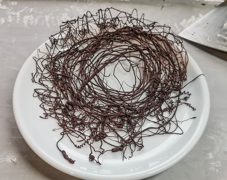 На освободившейся части мороженицы сделали «гнездо» из растопленного шоколада. Через минуту, когда оно застыло, переложили на блюдце.