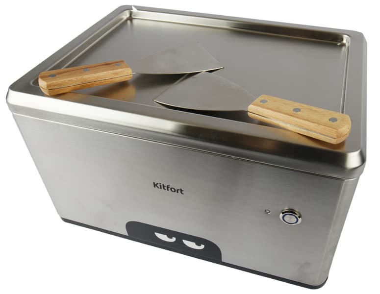 Комплект для работы Kitfort KT-1821 подобран очень удачно. Форма и размер шпателя позволяют делать три больших ролла на поверхности вдоль. Если мороженое сделано правильно, оно отлично снимается с поверхности.