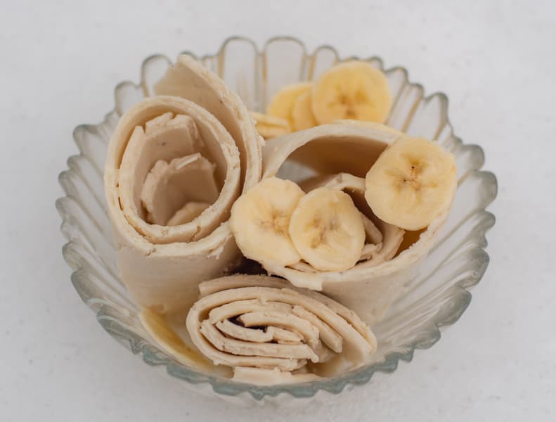 Накрыли поверхность фольгированной крышкой для выравнивания температуры и ускорения процесса заморозки. Через 5 минут смесь замерзла, скатали из нее рулеты, уложили в креманку.