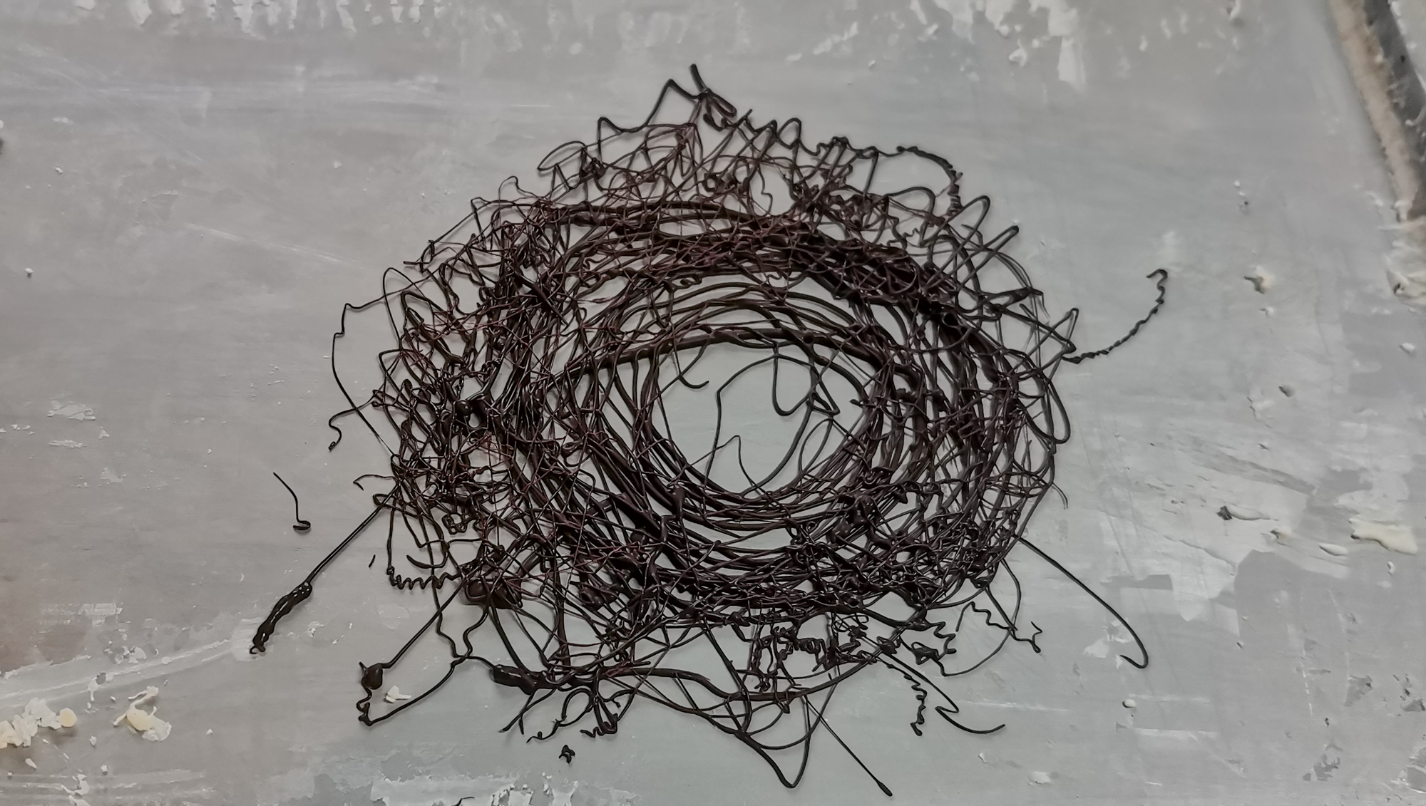 Вымесили пластичную массу, перенесли ее в угол рабочей поверхности. Остальную поверхность полили растопленным темным шоколадом.