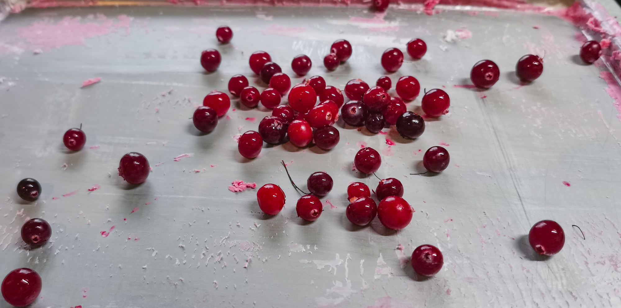 Ягоды клюквы раздавили на рабочей поверхности и перемешали со сгущенкой.