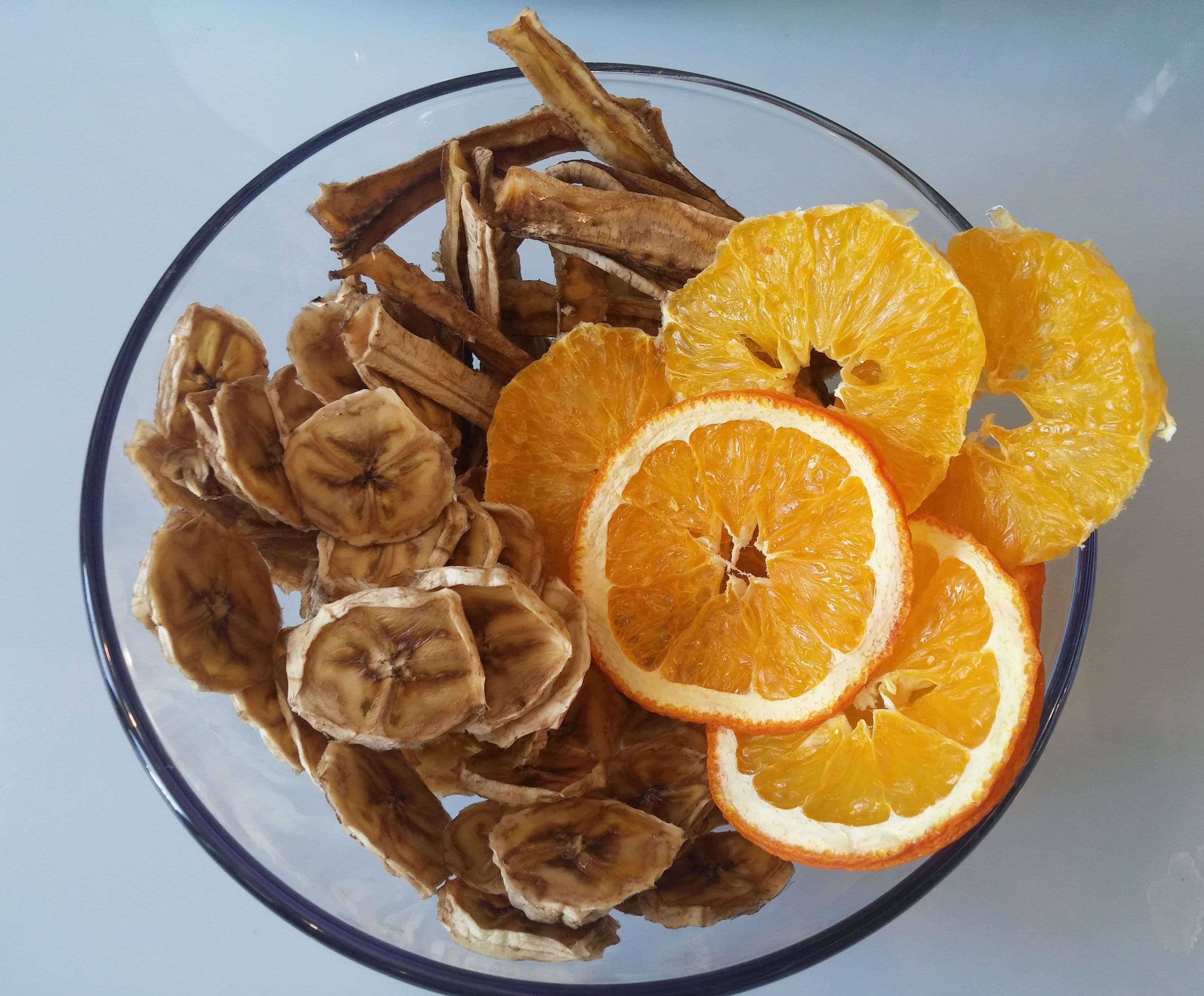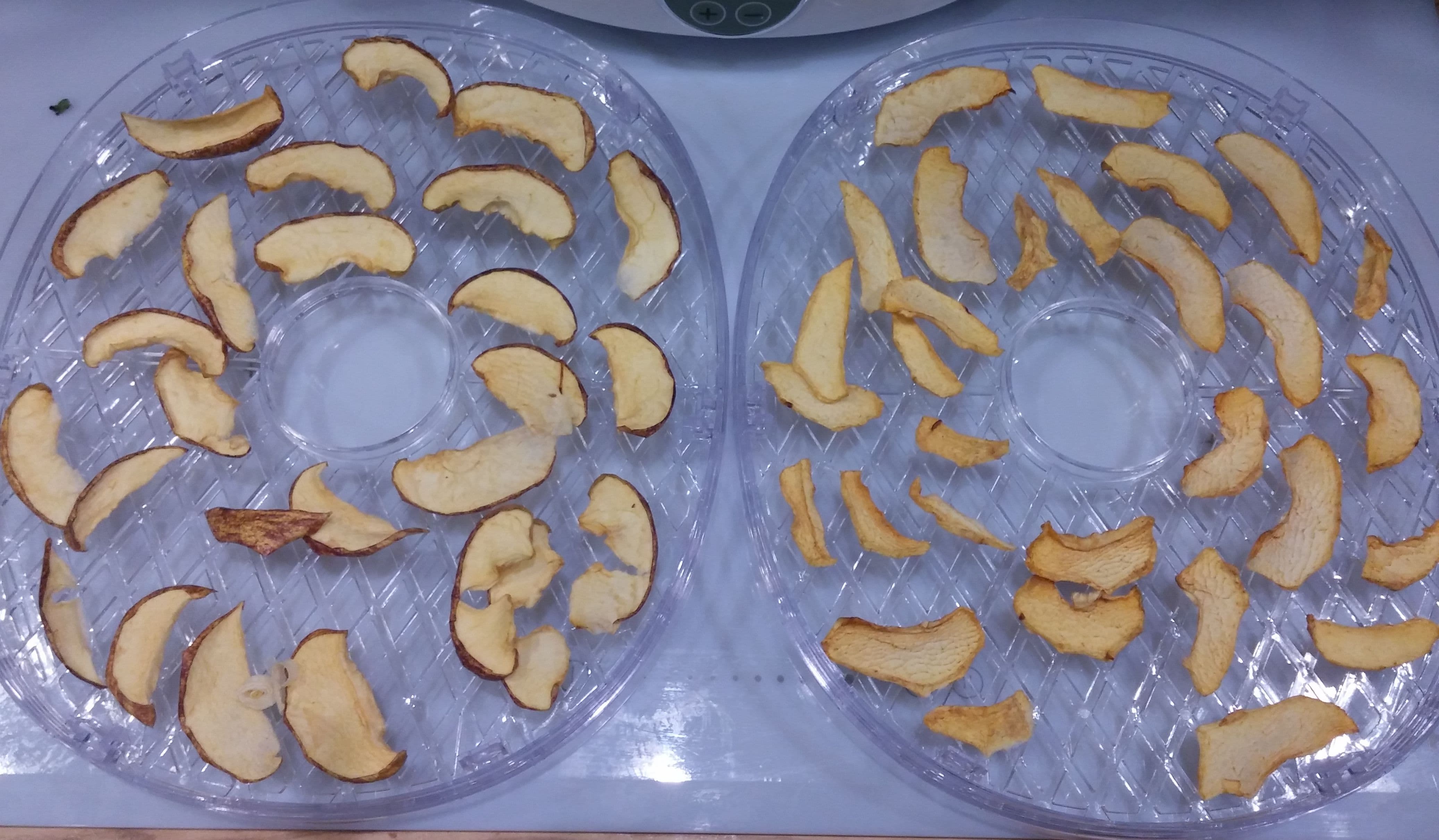 Очищенным яблокам было достаточно 9 часов при 50 °C, а их собратьям с кожурой — целых 11 часов с подъемом температуры до 65 °C. Бананы были готовы через 16 часов на 55-60 °C, а апельсины и вовсе сдались только спустя 22 часа от начала процесса.