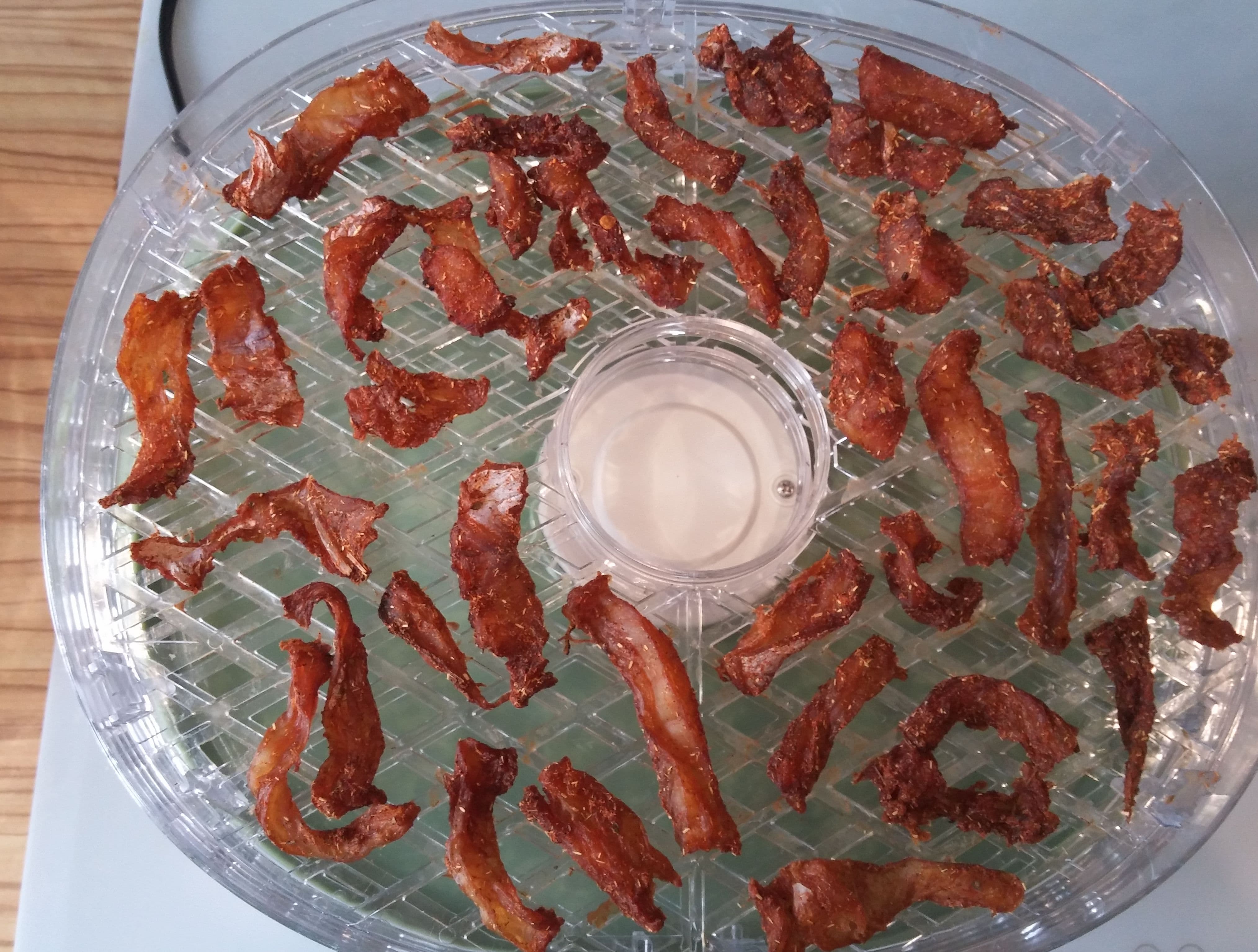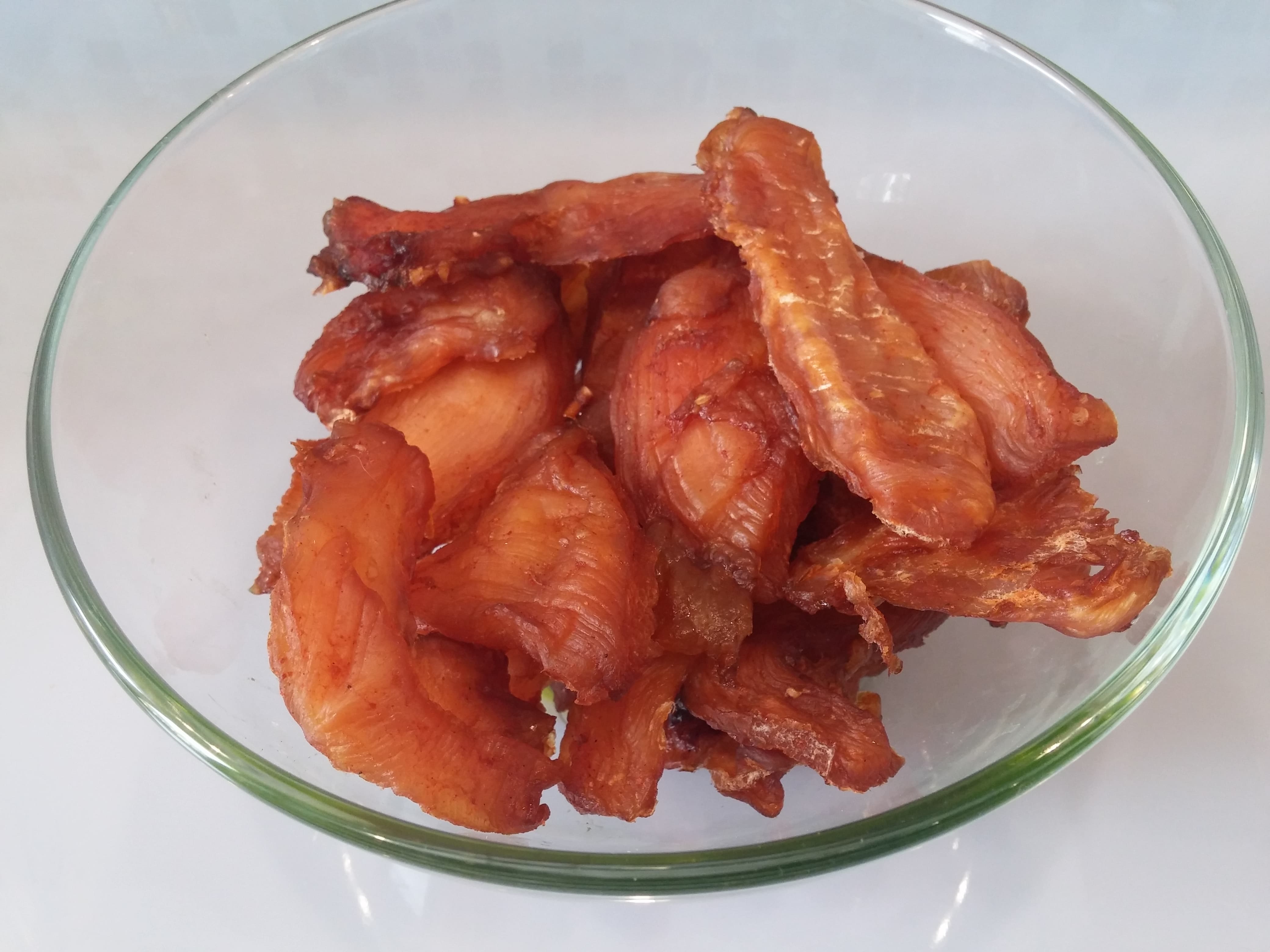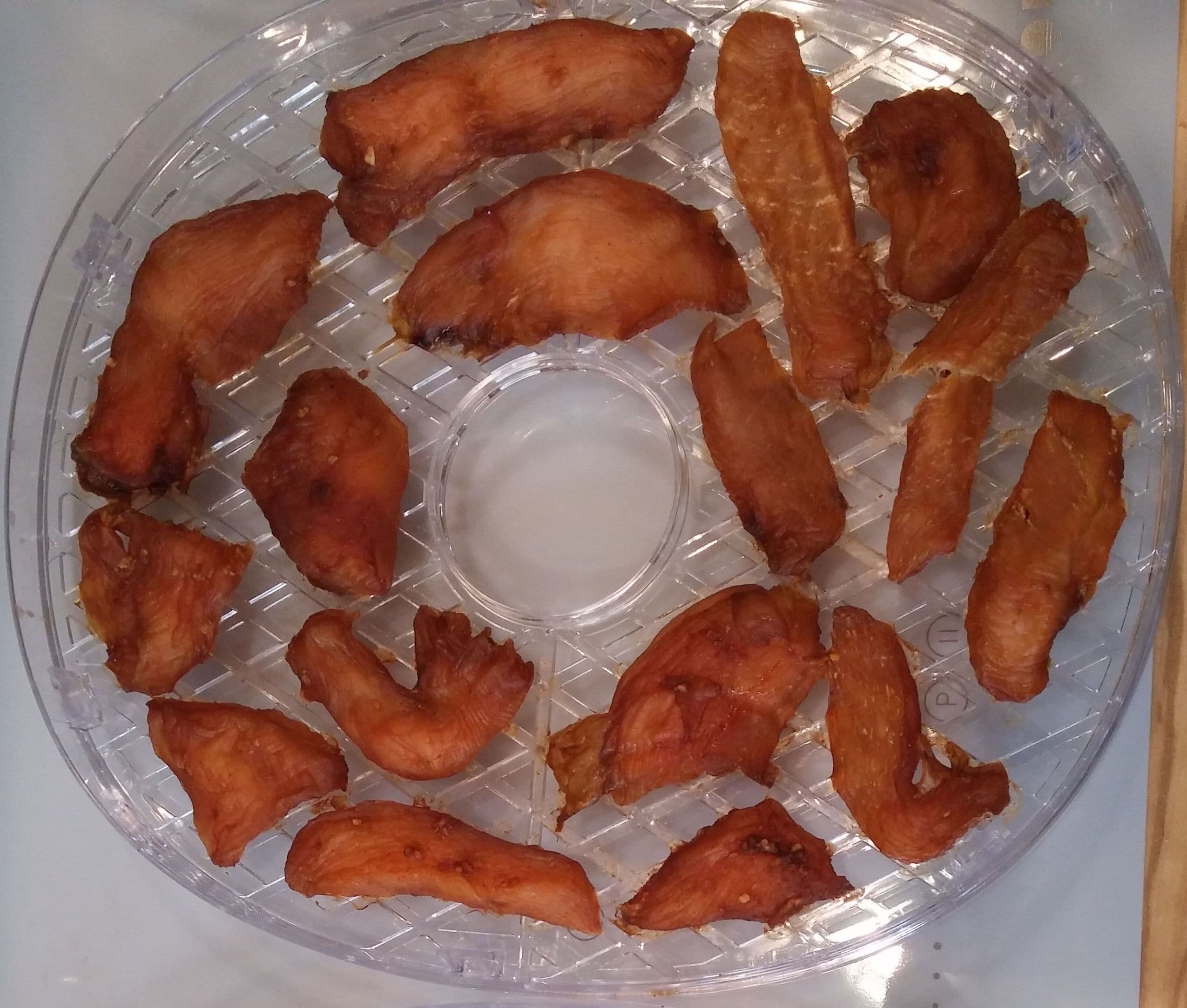 Спустя 7 часов на 65 °C и 4 часа на 50 °C грудка стала сухая по краям, чуть мягкая в центре толстых кусочков и ломкая на тонких частях. Любители описанного выше маринада могут представить яркий, сочный вкус сухой курицы (редко оксюморон бывает так удачен).