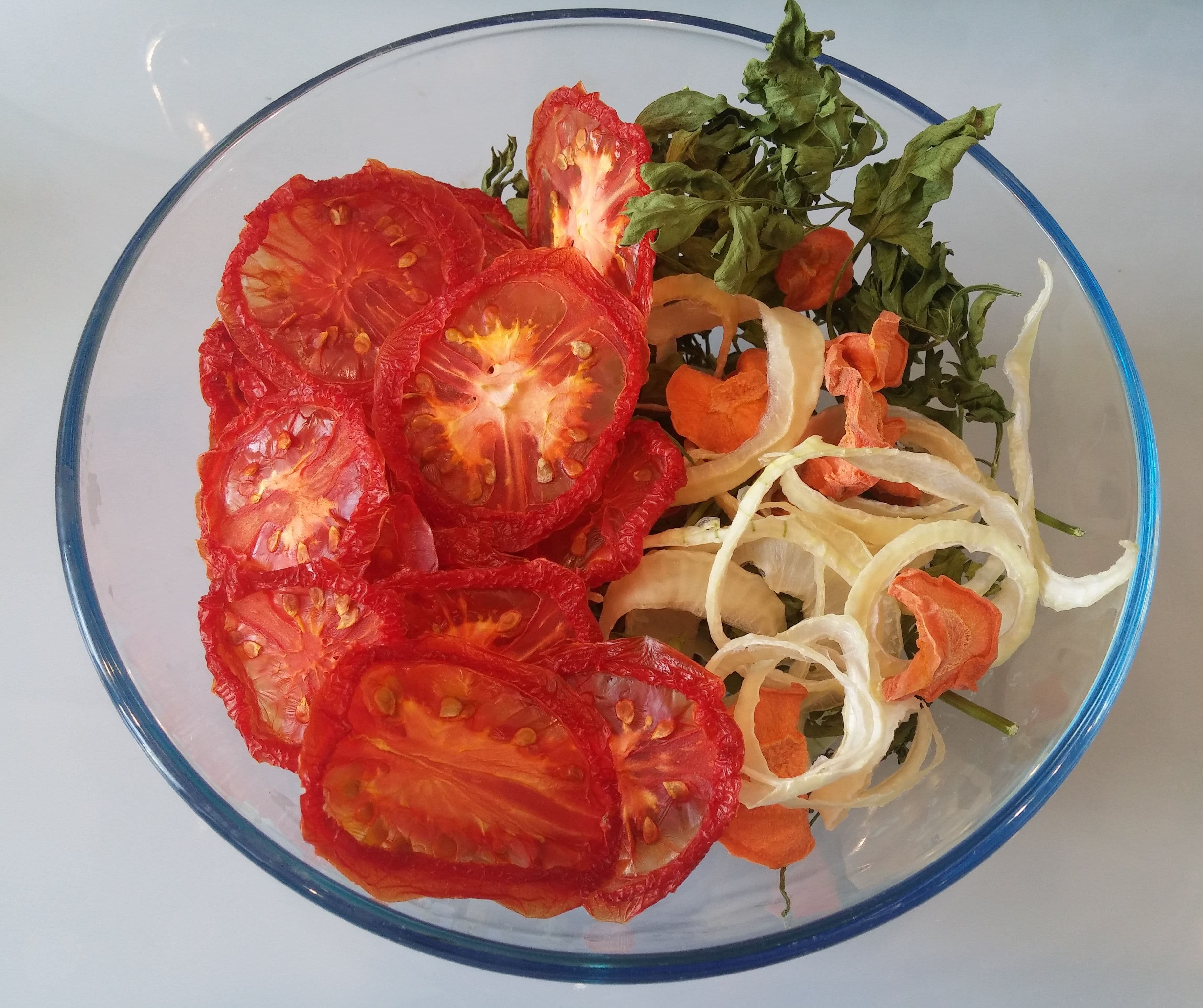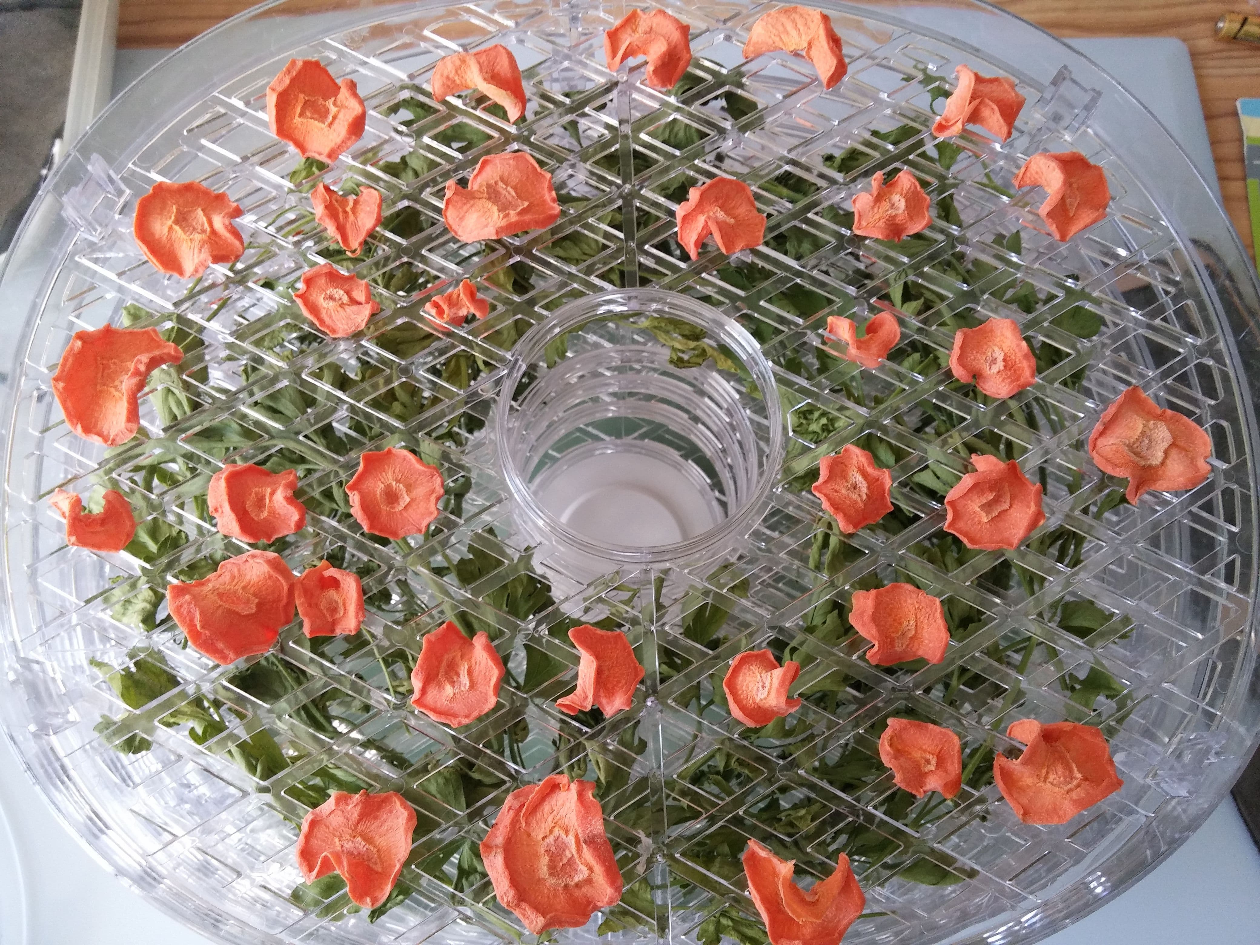 Высушено все было качественно и с примерной той же скоростью, что в других подобных моделях. Луку и петрушке потребовалось 9 часов при температуре 50 °C до готовности. Морковь обезвоживалась 8 часов при 45 °C и, хоть и уменьшилась в размерах, сохранила гибкость. Дольше всего сушились томаты: 16 часов на 60 °C, и некоторые кусочки еще сопротивлялись иссушению.