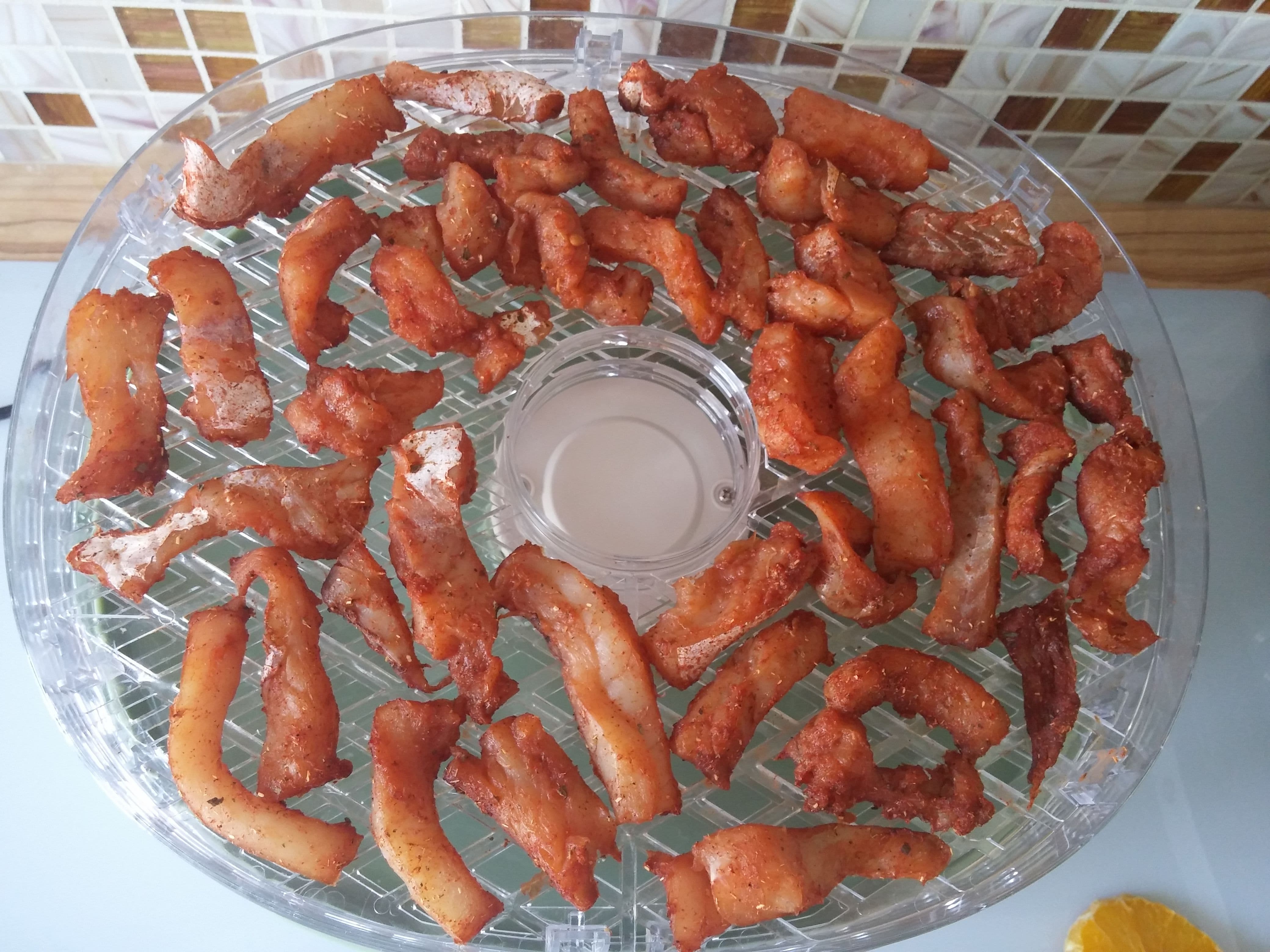 Затем кусочки выкладываем на лоток (в нашем случае промакивать было нечего, маринад был не особенно жидкий) и выставляем время и температуру по своему разумению. Мы выбрали 55 °C и ждали 16 часов и еще 8, что в сумме дает ровно сутки.