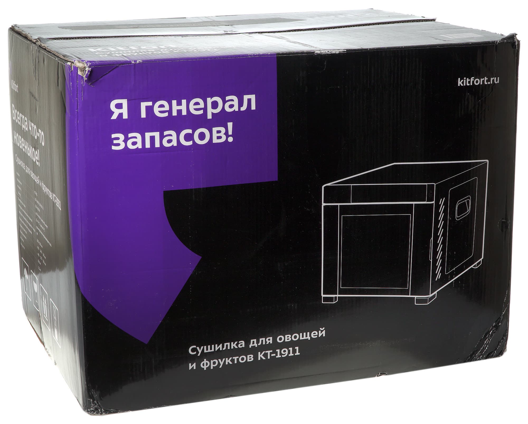 Сушилка прибыла на тесты в большой картонной коробке черного цвета без ручек. На коробке мы видим всю необходимую информация о приборе, его технические характеристики, название и схематический рисунок модели, а также очередной рекламный слоган Kitfort специально для данного устройства.