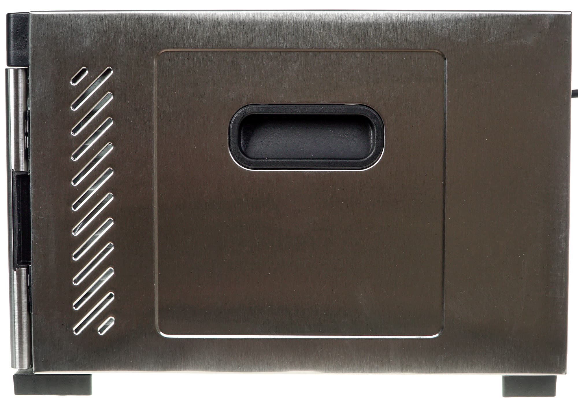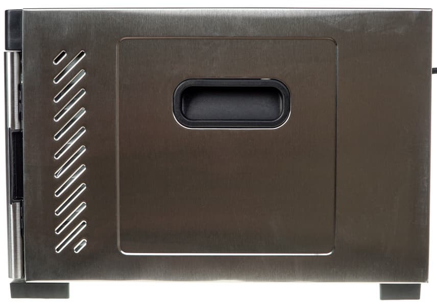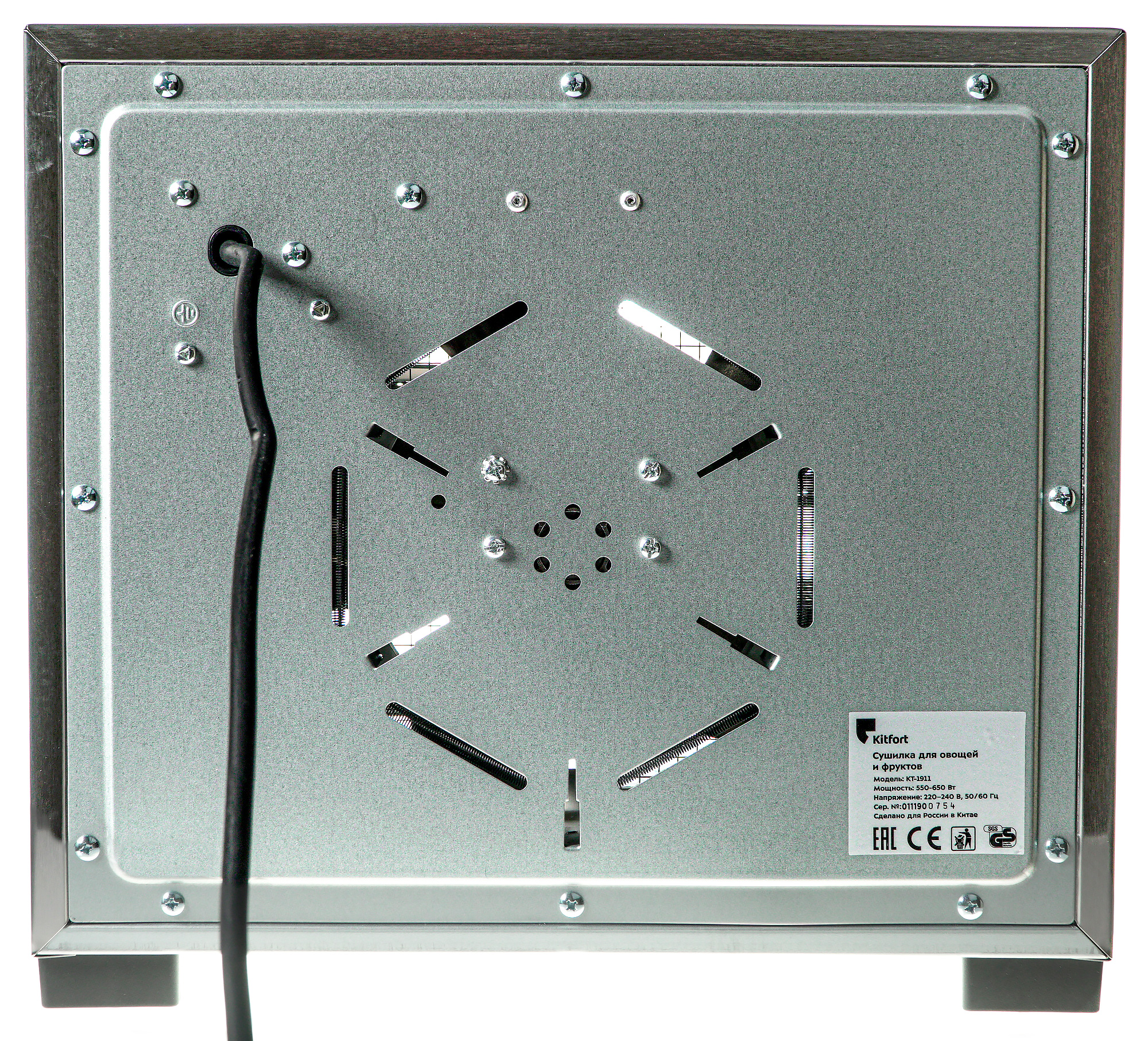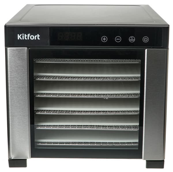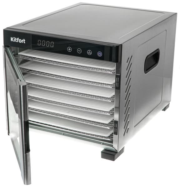 Сушилка КТ-1911 — внушительный прибор прямоугольной формы лаконичного современного дизайна. Корпус выполнен из нержавейки, дисплей черного цвета подсвечен яркими синими индикаторами. Дверца с большим стеклом позволяет наблюдать за происходящим внутри. На корпусе минимум пластиковых элементов — только ножки прибора и вставки-ручки для удобной переноски. Дверца закрывается на две магнитные защелки.
