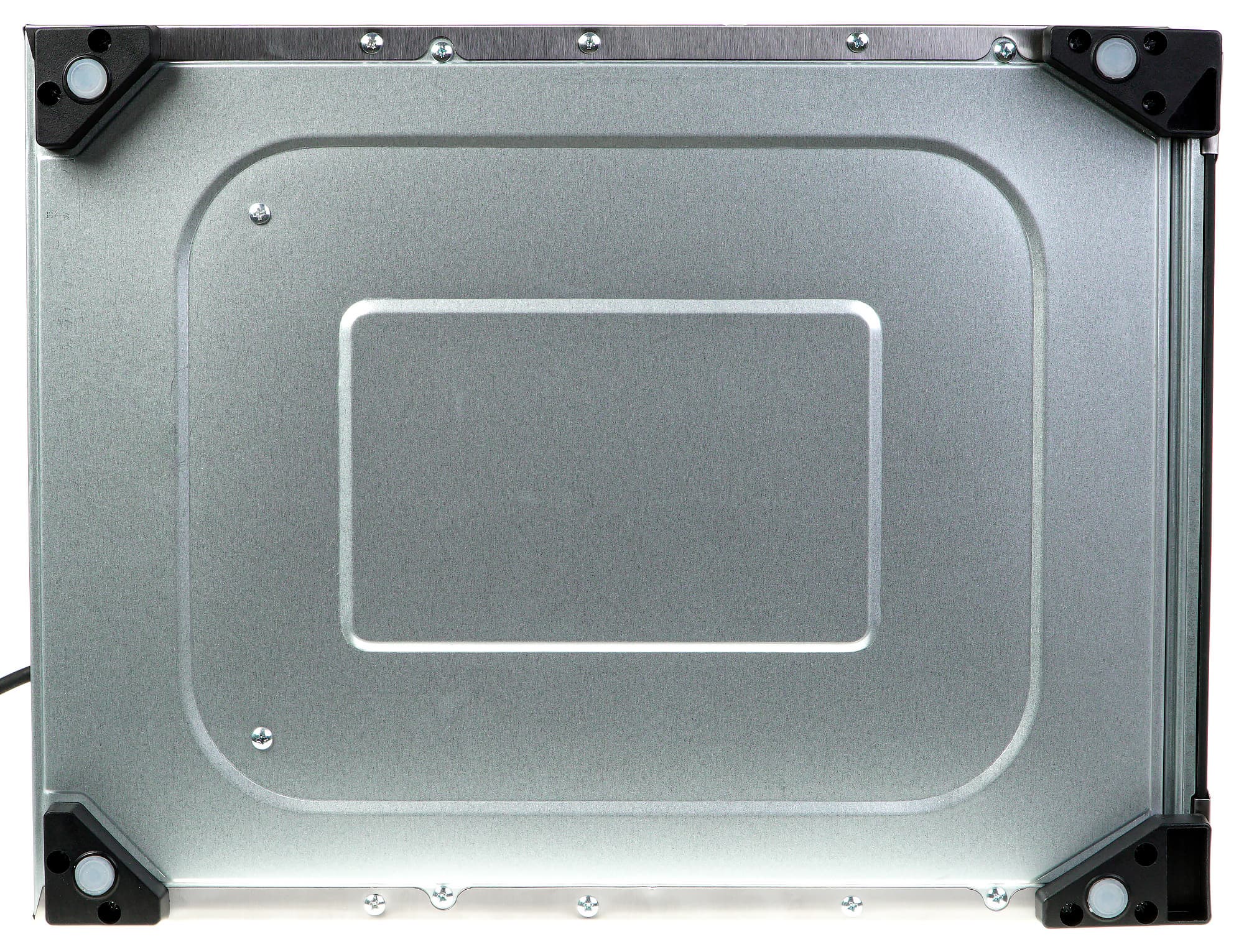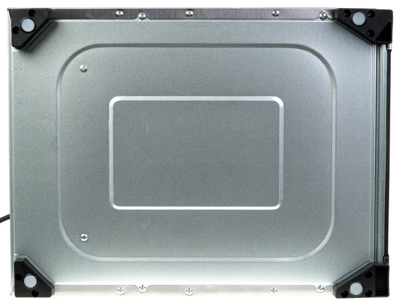 Сзади мы видим шурупы крепежа мотора вентилятора, ряд отверстий для вентиляции, шнур электропитания и бирку с номером и характеристиками модели.