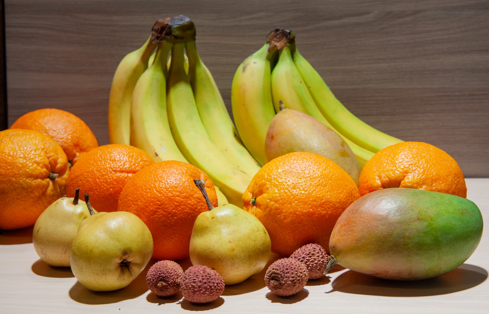 Для приготовления полезных натуральных фруктовых чипсов мы взяли бананы средней спелости, манго, груши, апельсины и личи.