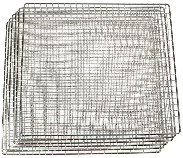 6 мелкоячеистых полипропиленовых поддонов предназначены для сушки мелких продуктов и зелени. Они укладываются на основные нержавеющие сверху.