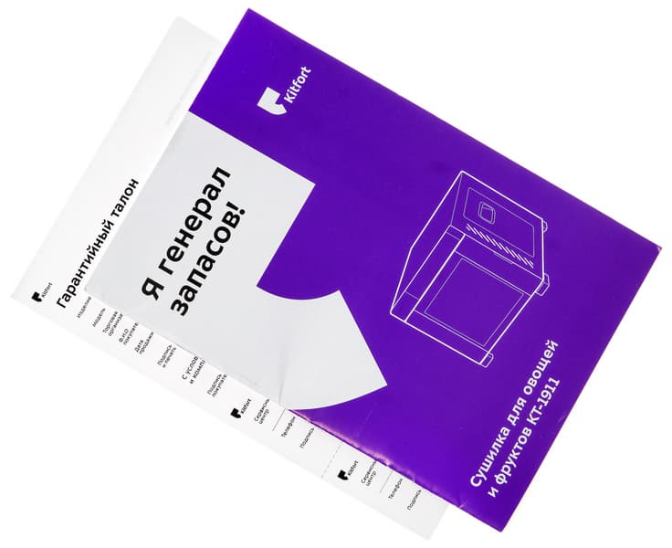 Инструкция к КТ-1911 представляет собой брошюру А5 формата на 11 страницах глянцевой бумаги. В ней подробно описано все, что нужно знать для работы с прибором. Это общие сведения, комплектация, устройство, советы и рекомендации по сушке, технические характеристики, меры предосторожности, а также чистка, обслуживание, уход и подготовка к работе данного устройства.
