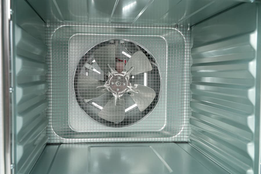 Внутри прибора массивный металлический вентилятор, защищенный решеткой, сбоку 6 направляющих для поддонов. Расстояние между поддонами не регулируется и составляет 3,6 см. Нет никаких лишних элементов и непродуманных крепежей — все устроено для максимально удобного ухода за устройством.