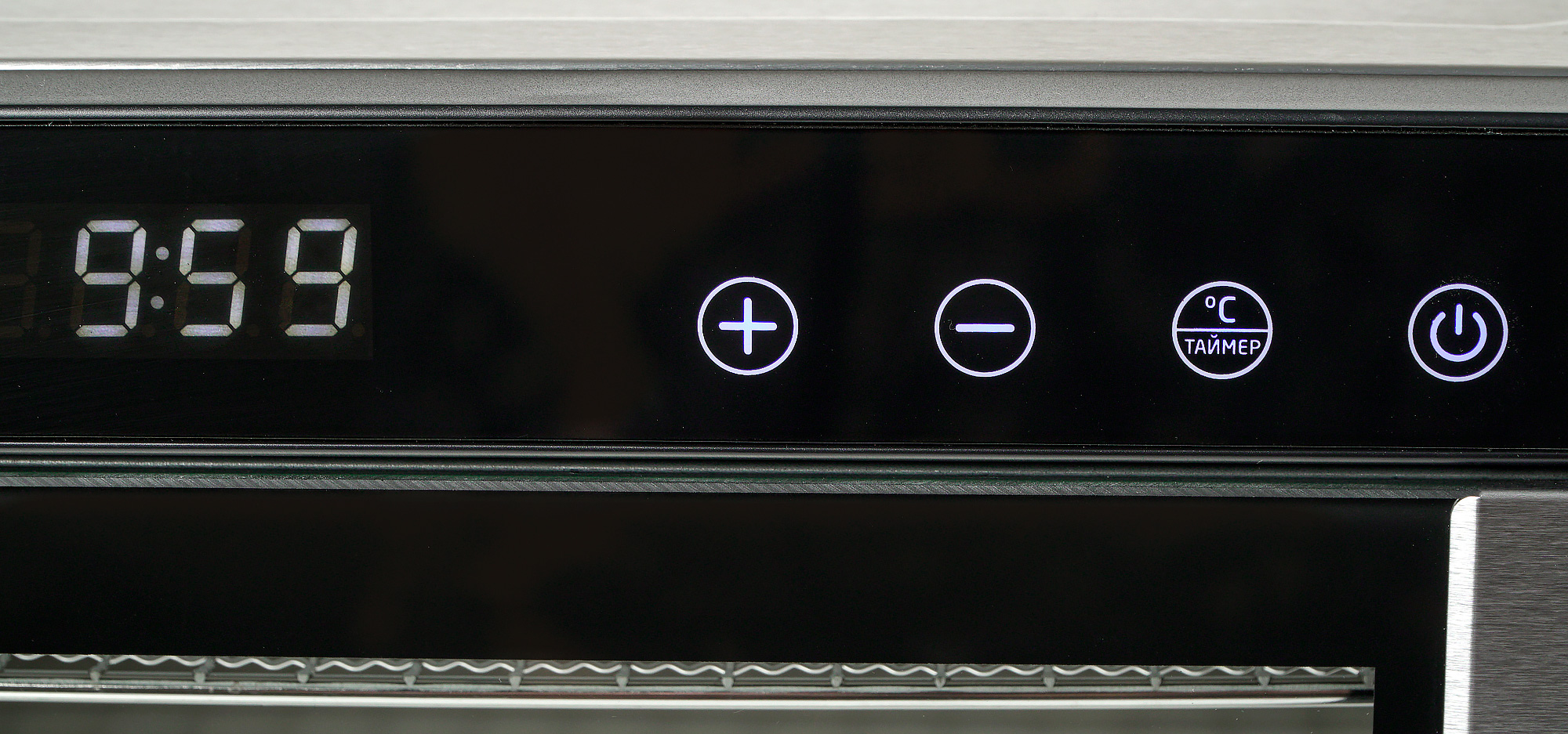 При включении режима сушки по умолчанию стоят параметры 10 часов, 70 °C. Клавишами «+» и «−» можно менять значения в диапазоне от 30 минут до 24 часов с шагом в 30 минут и от 35 до 75 °C с шагом в 5 градусов. При изменении настроек необходимо подождать 3 секунды, чтобы значение зафиксировалось. В процессе работы таймер на дисплее показывает время, оставшееся до завершения. После окончания процесса сушки, сушилка подает пятикратный звуковой сигнал, а на дисплее отображается надпись «end». Управление устройством простое и интуитивно понятное. Сенсорные кнопки достаточно чувствительны, их можно нажимать даже мокрой рукой.
