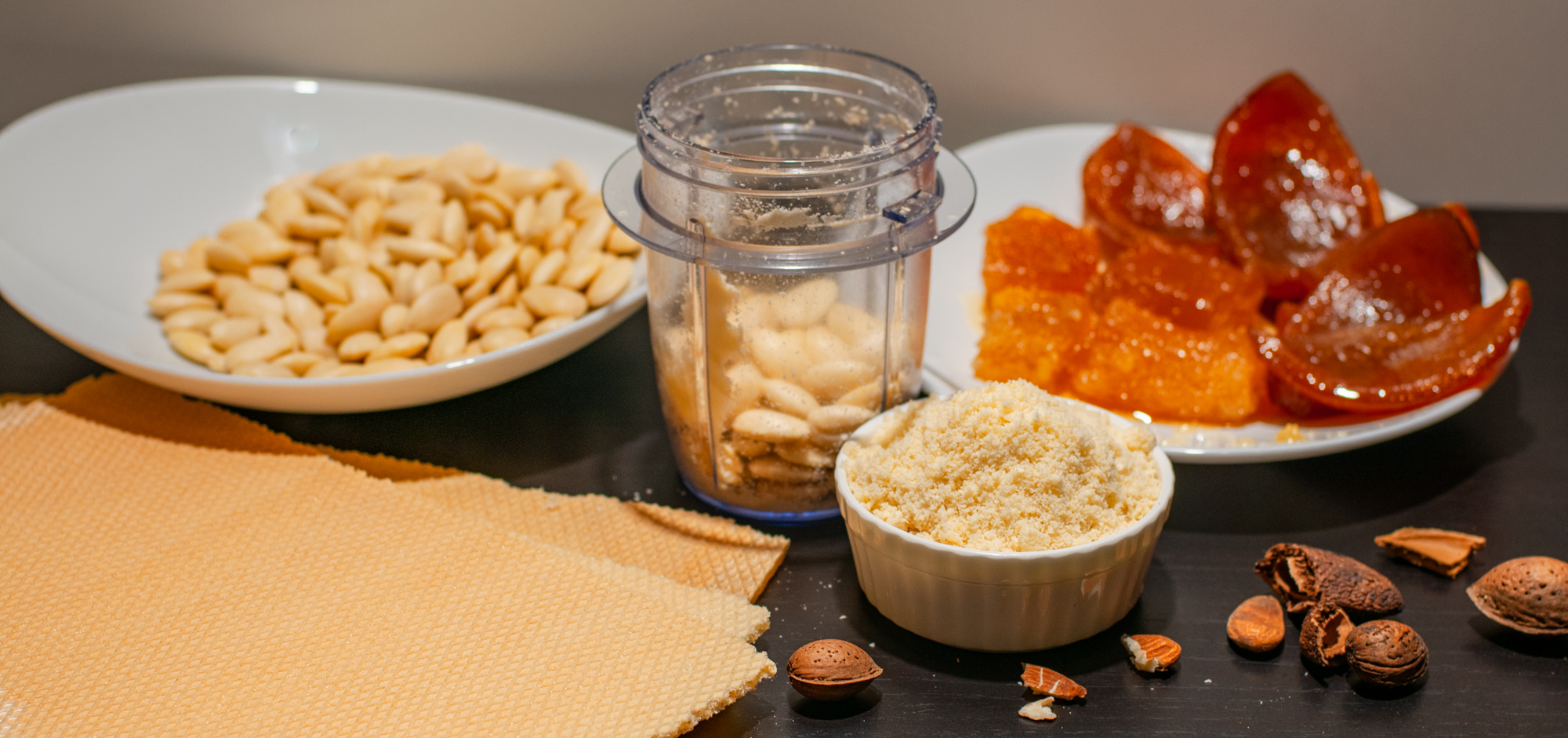 Для прованских «Калиссонов» нам понадобился миндаль, апельсины для цукатов, сахарная пудра, яйцо и тонкие вафли.