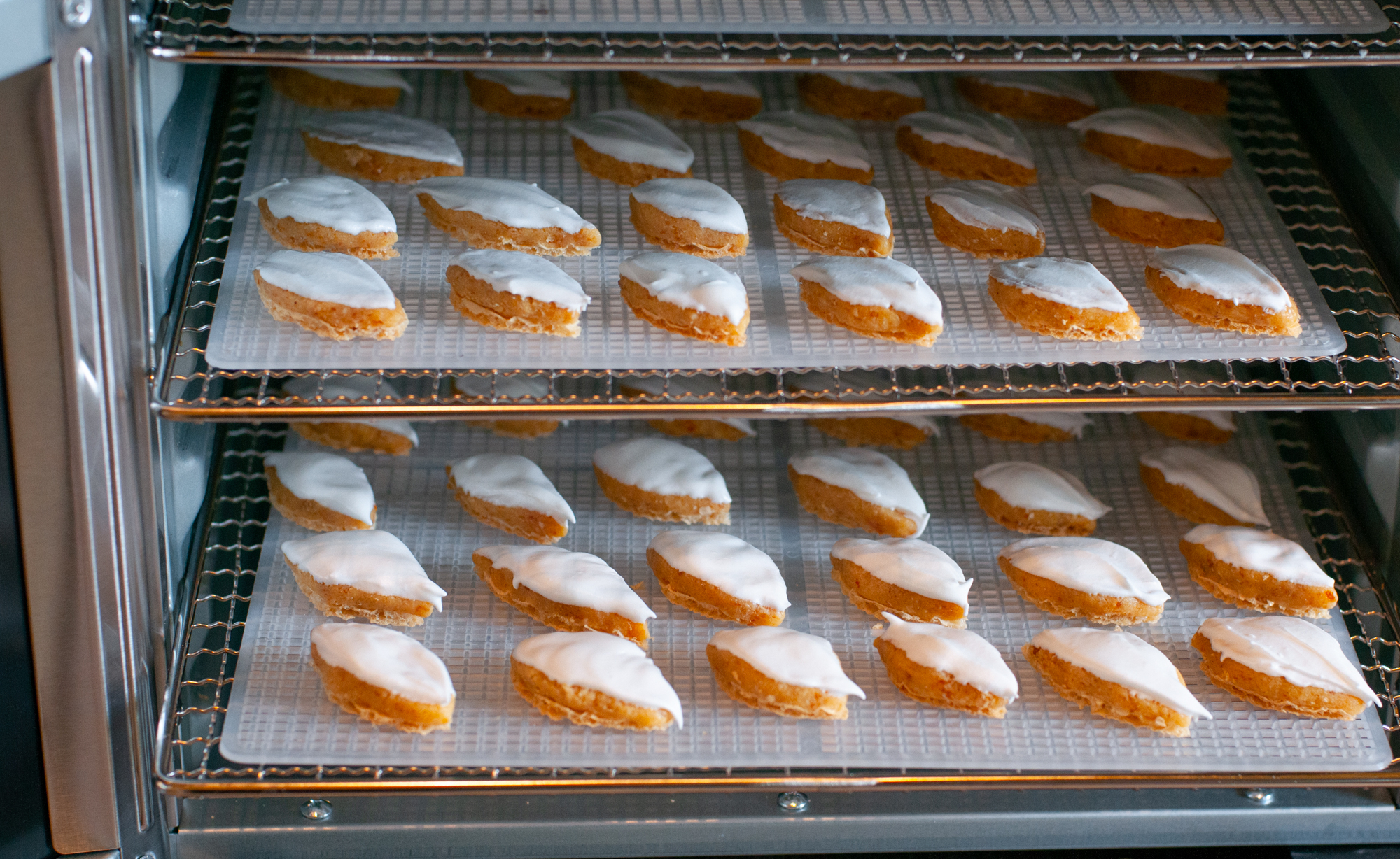 При приготовлении этих пирожных сушильную камеру, за неимением таковой, заменяют духовкой с открытой дверцей. Но при таком способе всегда есть риск перегреть пирожные, подпалив вафельную подложку, или испортить белоснежный цвет белковой глазури. С использованием сушилки этот риск полностью пропадает, и процесс становится не только контролируемым, но и отчасти аутентичным.
