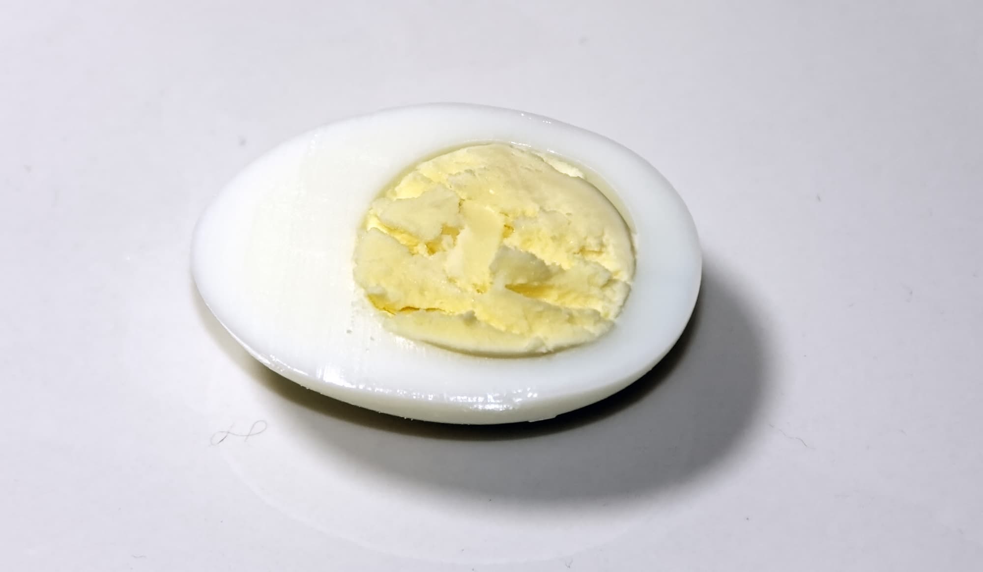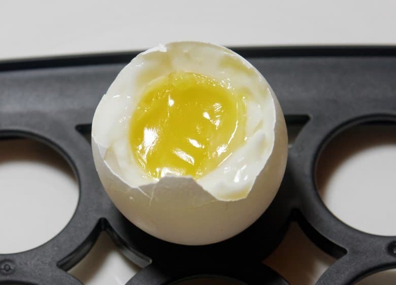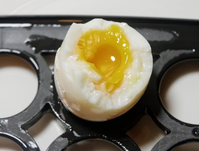 С варкой яиц вкрутую мы разобрались. А что же с режимом всмятку? Вот, например, результат варки двух яиц на режиме Soft: как мы видим, в этом случае калибровка оказалась не слишком точной: желток успел «схватиться», хоть и не затвердел.