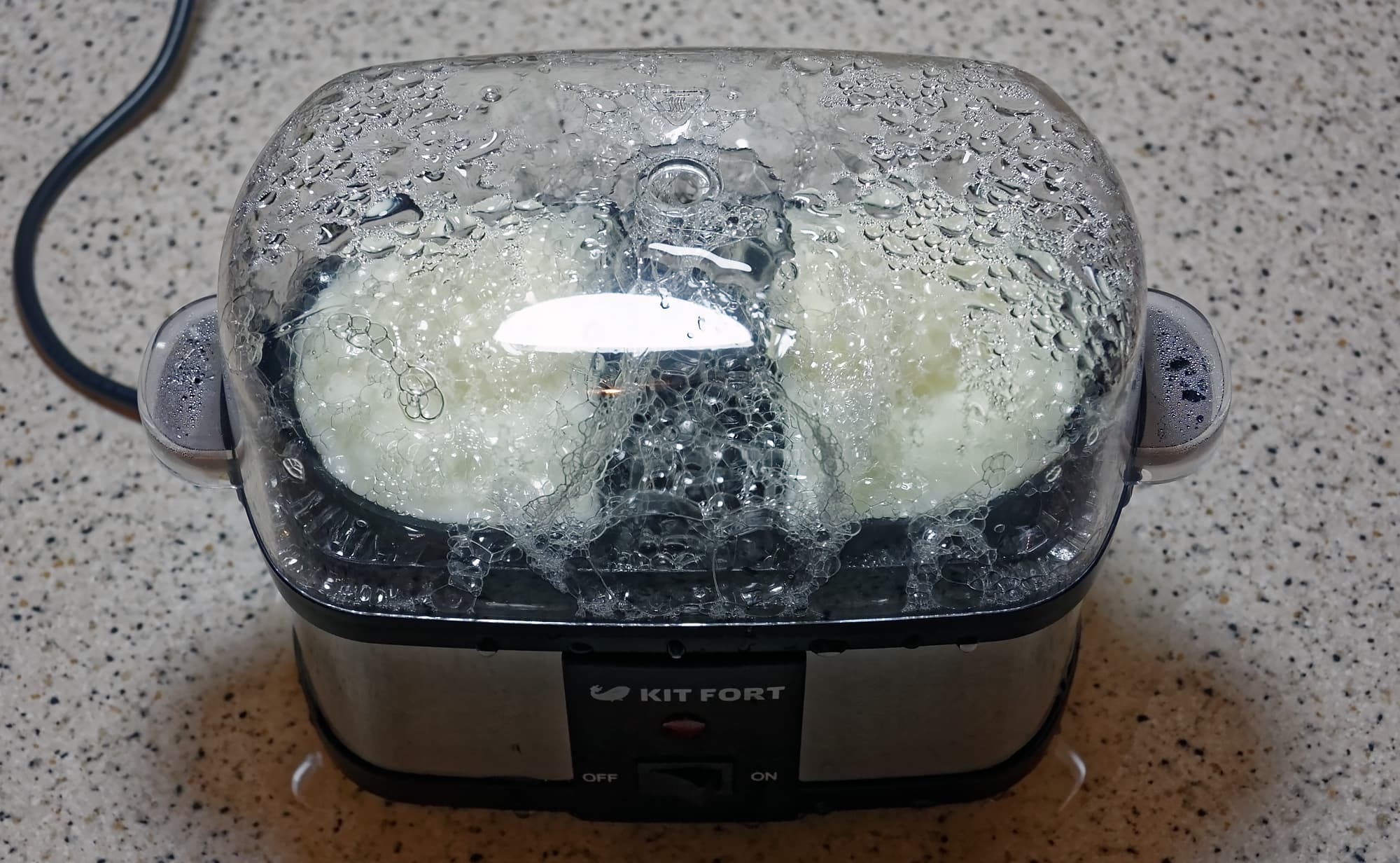 Режим приготовления яиц на пару́ в специальных поддонах нас не впечатлил. Причин тому сразу несколько: и необходимость тщательно следить за тем, чтобы ни капли белка не попало в чашу с водой (на фото видно, как он начинает пениться при кипении), и небольшой объем самих поддонов, и сложность в их очистке от частиц белка.