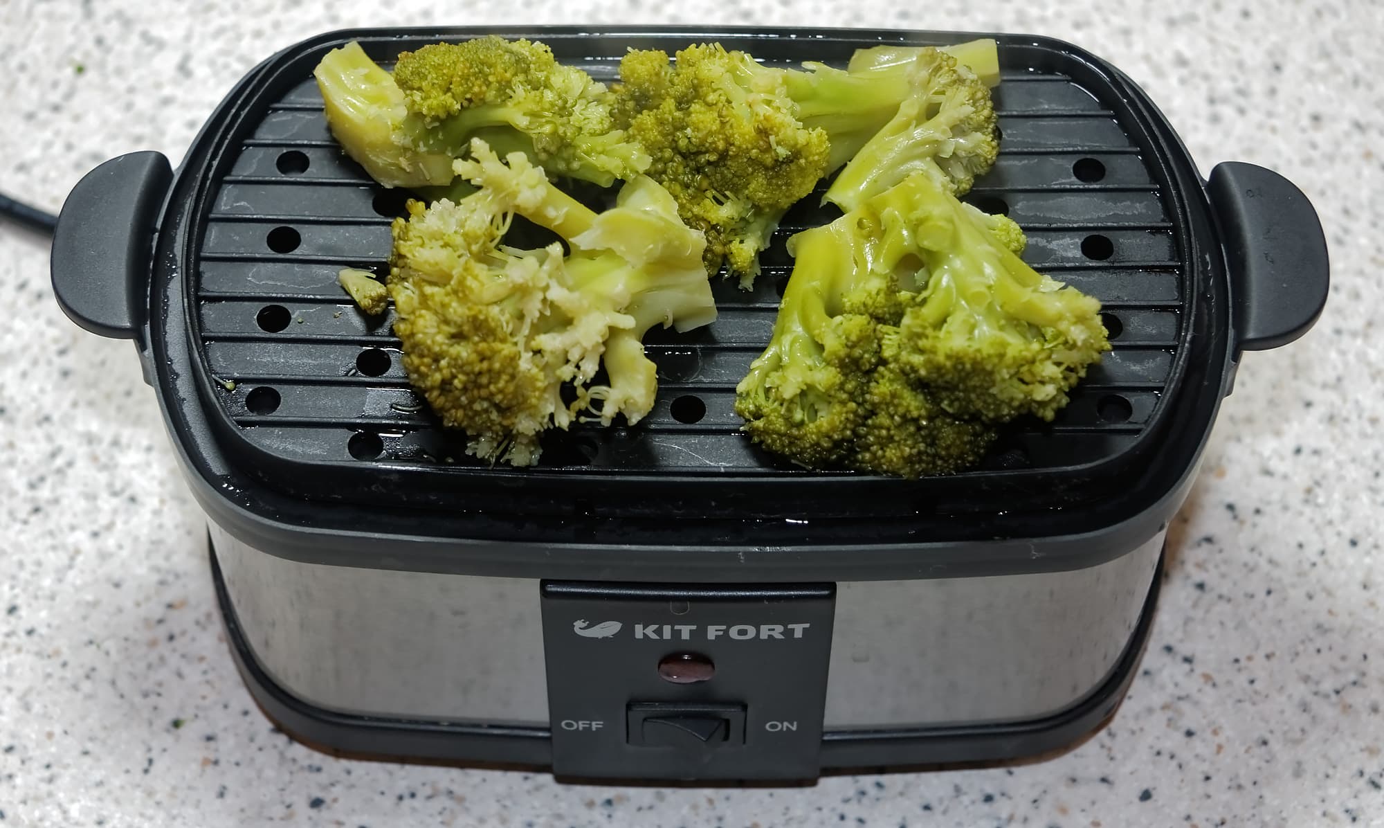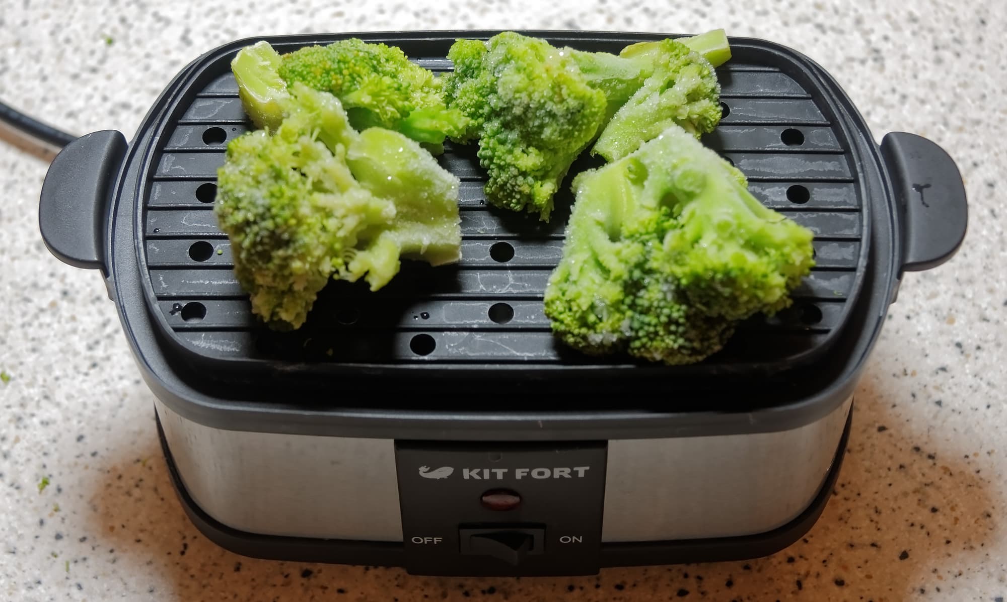 Несмотря на довольно небольшой объем яйцеварки, мы решили проверить, как она справится с приготовлением продуктов на пару́. Для этого мы взяли несколько соцветий замороженной капусты брокколи и выложили их на подставку-стимер. Готовили 15 минут, потратив 0,08 кВт·ч.