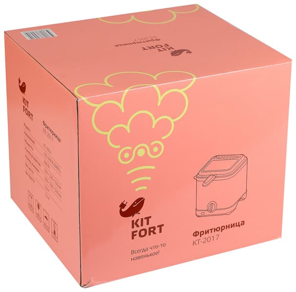 Фритюрница упакована в небольшую картонную коробку-параллелепипед розового цвета. Оформление легко узнаваемо и соответствует фирменному стилю Kitfort. Информация, размещенная на боковых сторонах, знакомит с техническими характеристиками и описанием прибора. На фронтальных сторонах можно увидеть схематическое изображение прибора, его название и модель. Ручкой для переноски упаковка не оснащена.