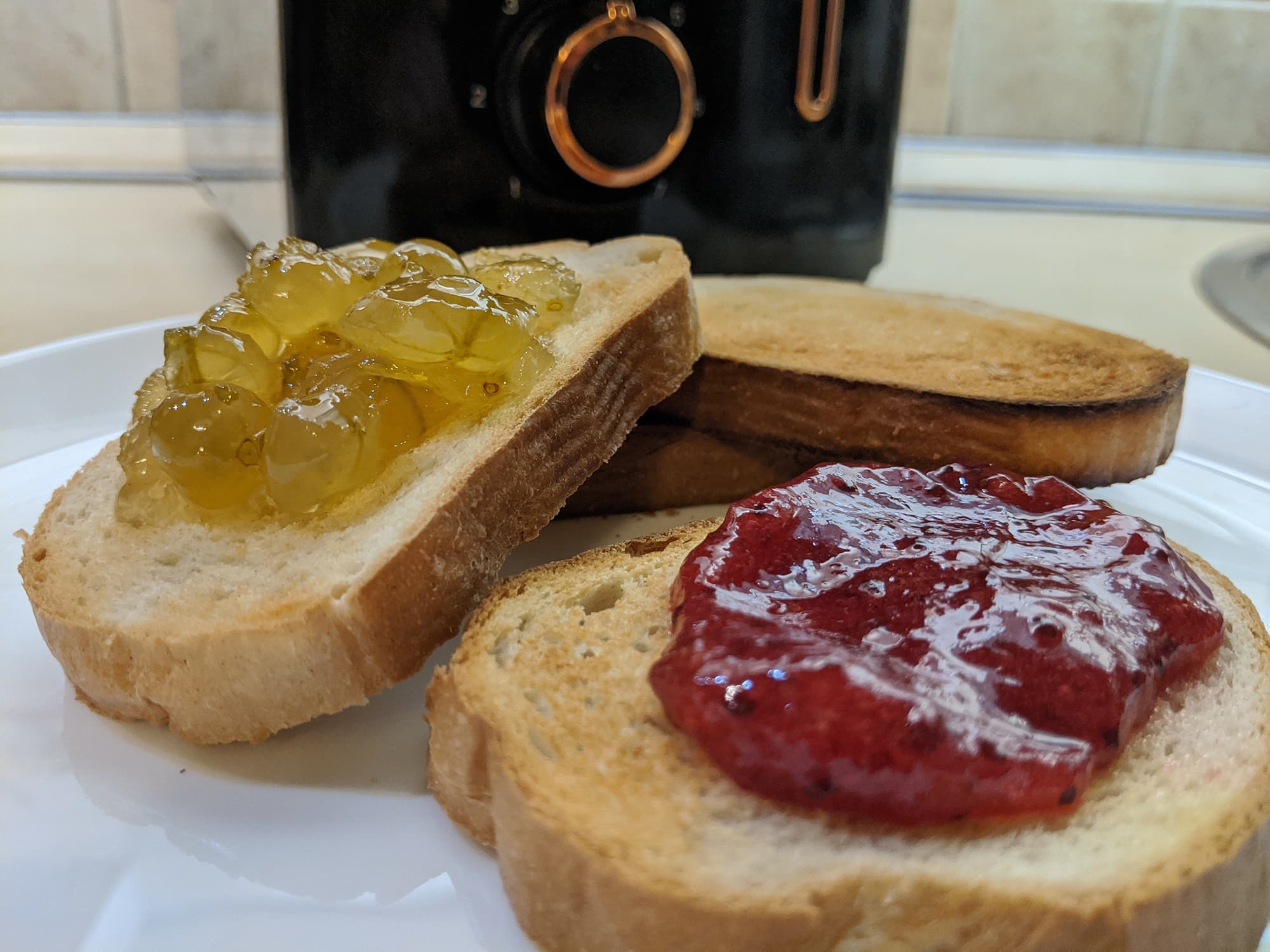 Так вот, на горячие ломтики надо немедленно нанести джем, варенье или сгущенку — зависит от того, что есть под рукой.