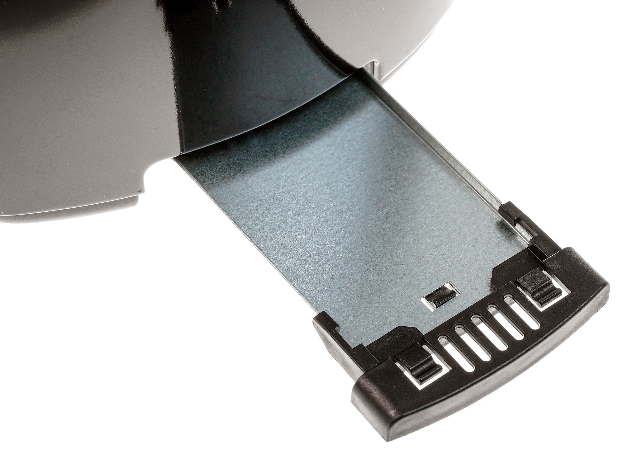 Поддон представляет собой металлический прямоугольный подносик с закругленными углами, небольшими бортиками и длиной значительно большей, чем шириной. Язычок подноса снабжен двумя защелками. Чтобы вставить его в корпус, надо поместить поддон на направляющие вдоль дна и задвинуть в корпус до щелчка.