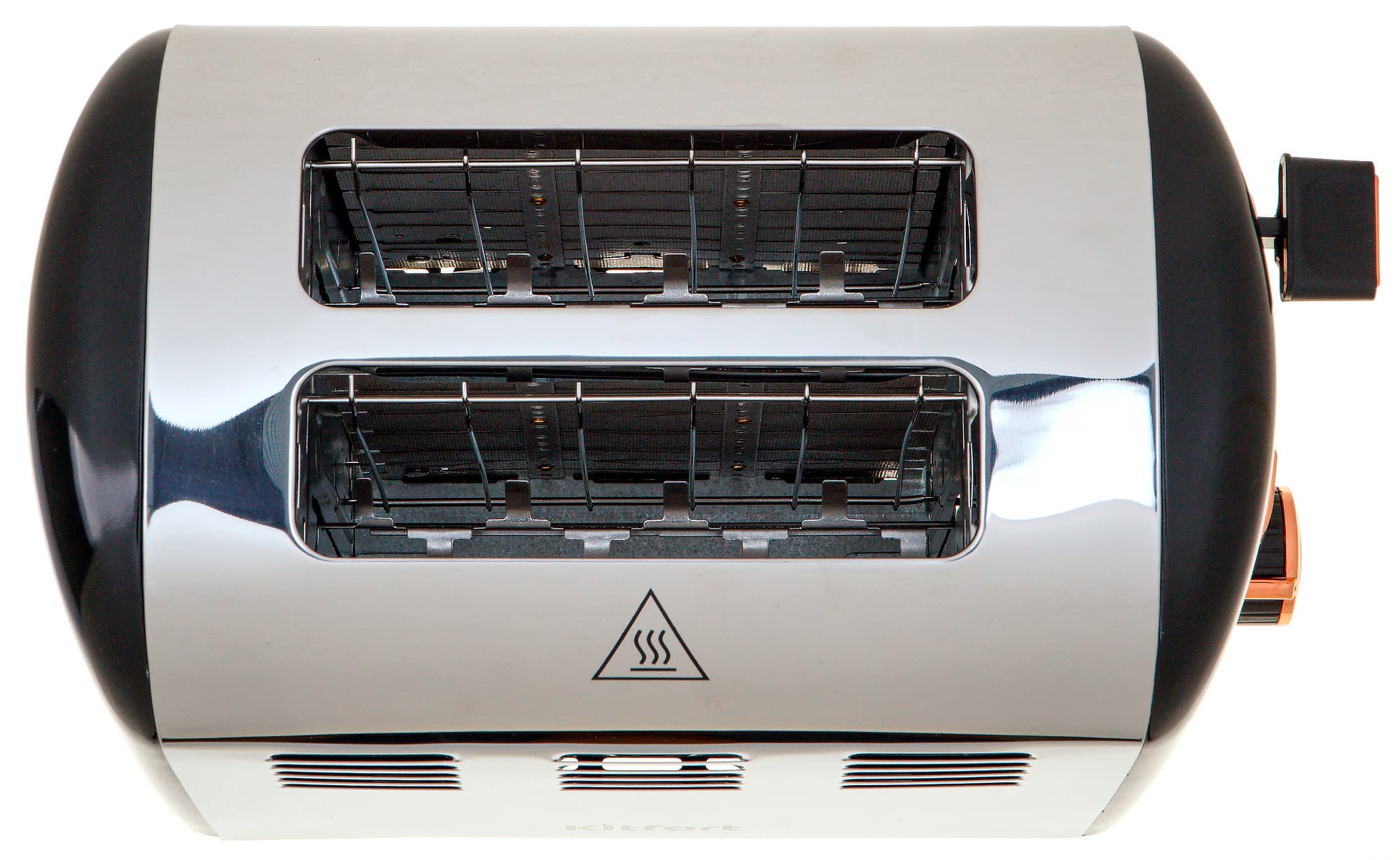 Кнопки, расположенные вертикально, нажимаются с отчетливым щелчком, а их значения также нанесены на корпусе. Рычаг расположен под правую руку и двигается в окаймленном медью направляющем канале. У него плоская, удобная для надавливания сверху рукоятка, украшенная медной полоской с торца. Рычаг немного подпружинен и, если прибор включен в розетку, фиксируется в нижнем положении, сдвигая решетки в слотах для хлеба, поднимая поддерживающую ломоть спицу и включая тостер — и все это одновременно. В выключенном состоянии он не фиксируется.