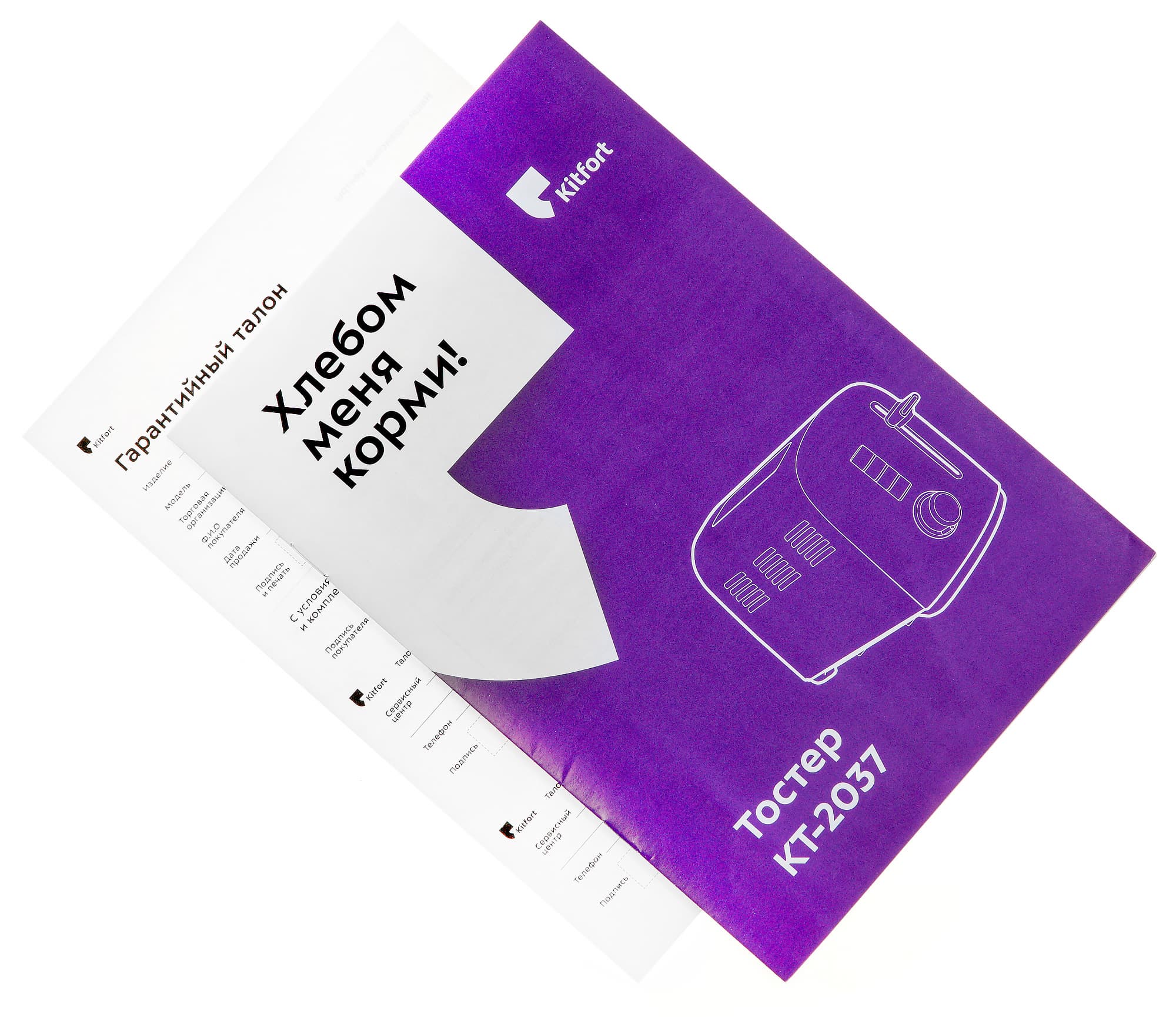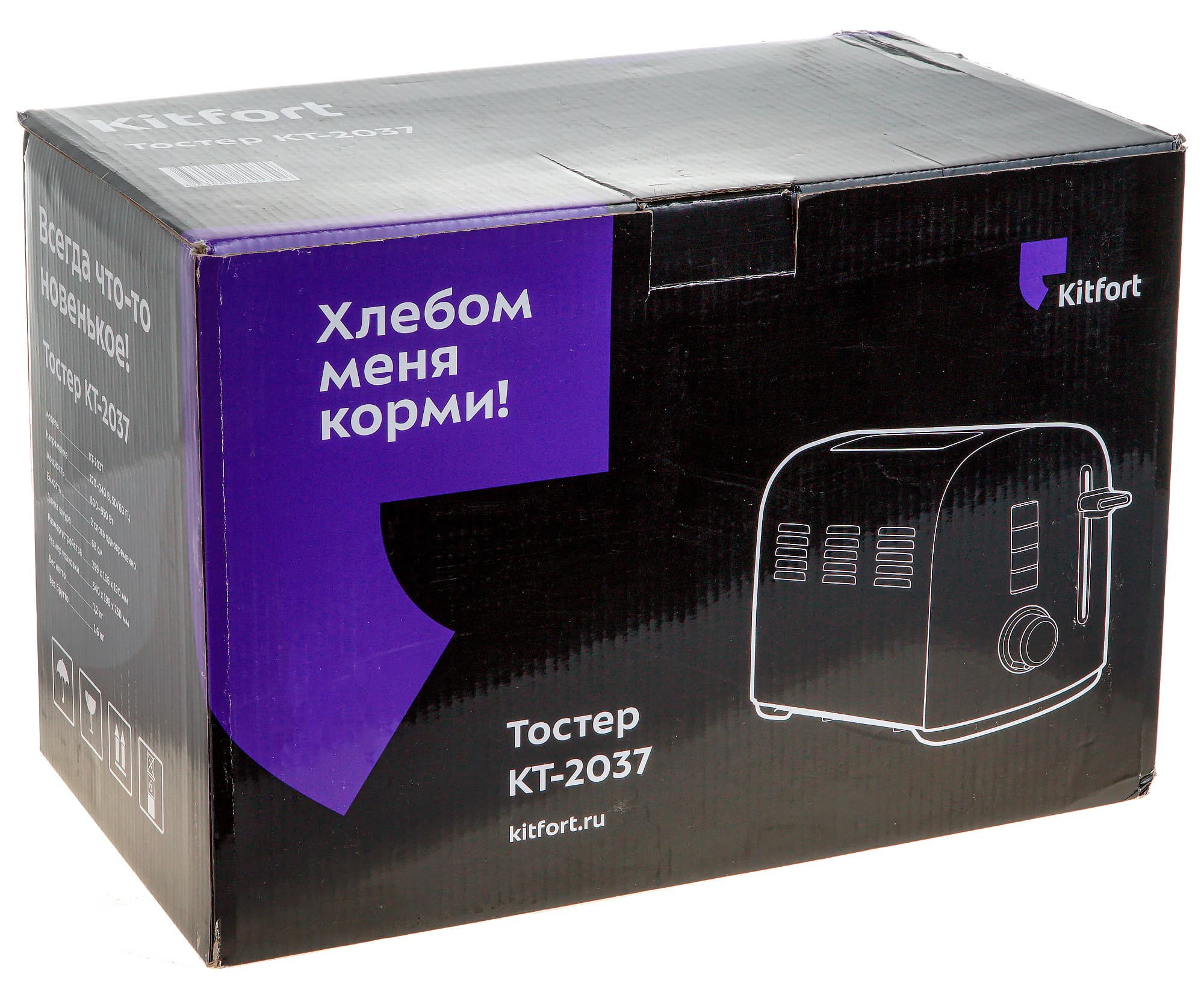 Черная коробка с фиолетовыми вставками и белыми надписями характерна для техники компании Kitfort и узнается с первого взгляда. На ее широких сторонах мы видим схематическое изображение тостера KT-2037, слоган «Хлебом меня корми», название и модель прибора.