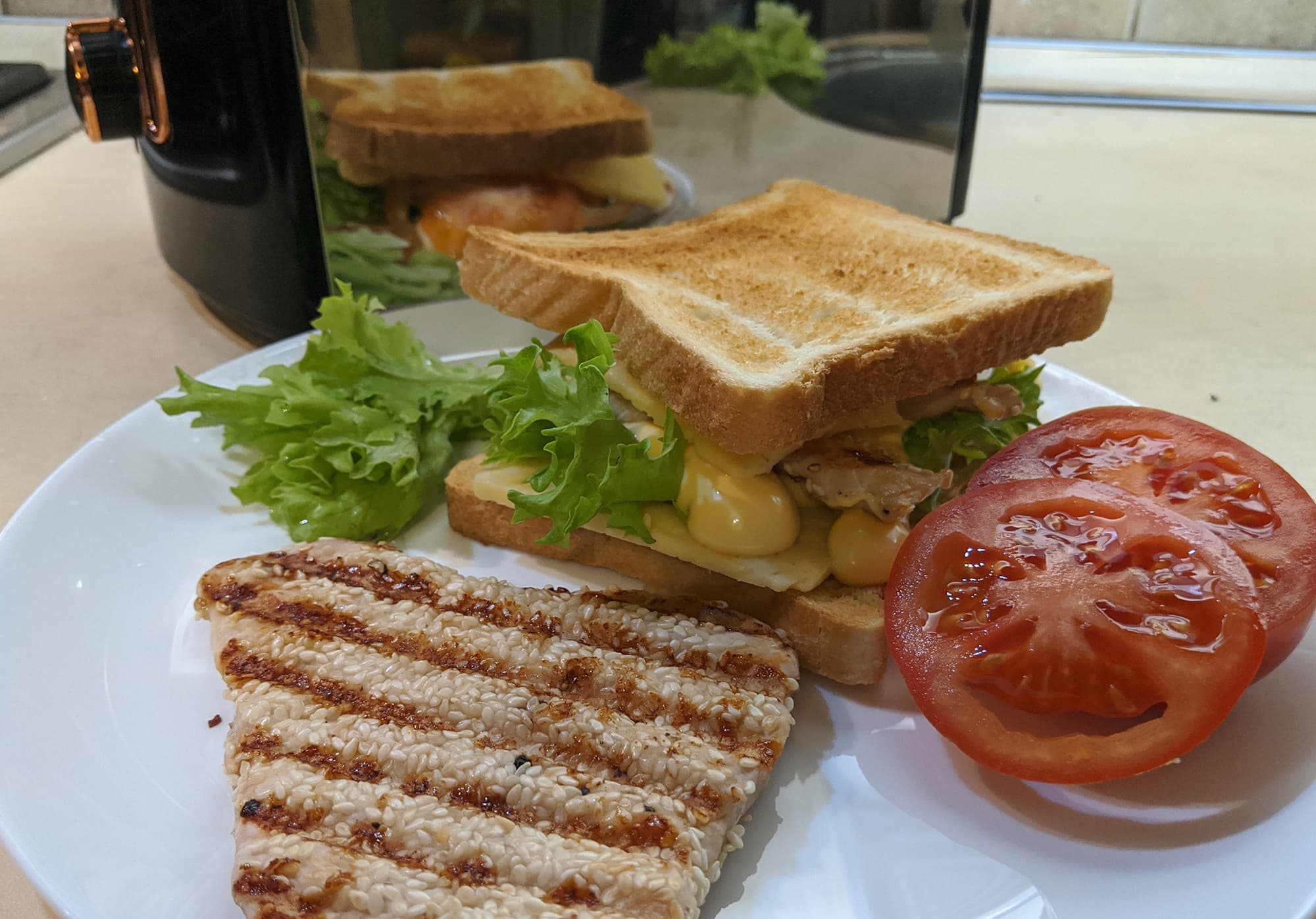 У нас был приготовленный в кунжуте стейк индейки, и мы просто положили его между двумя ломтями тостового хлеба, зажаренными до третьей степени в нашем приборе.