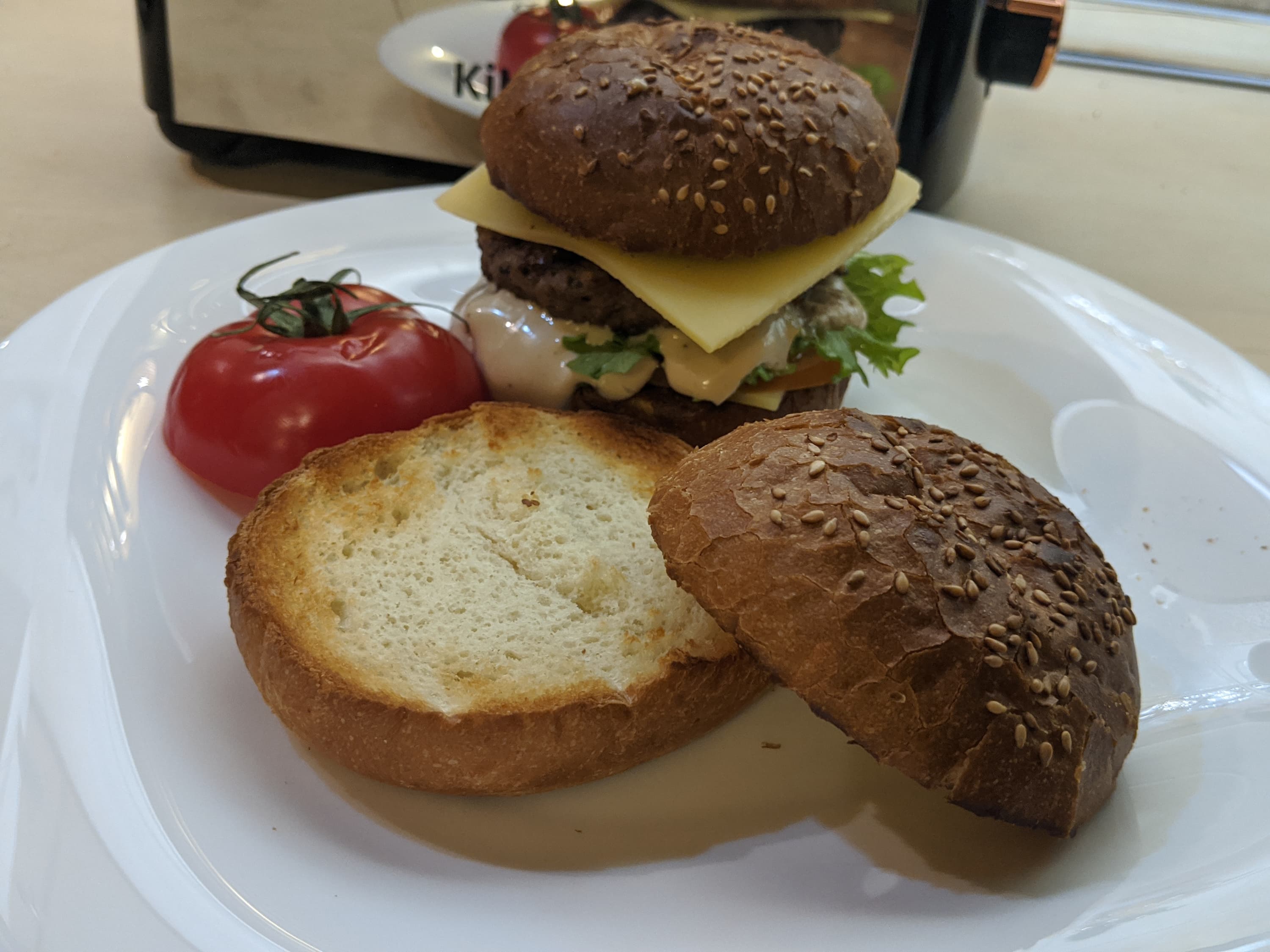 Толстые булочки для гамбургеров, которые надо разогреть до корочки только с одной стороны, — это задачка как раз для нашего тостера с его режимом «Односторонний».