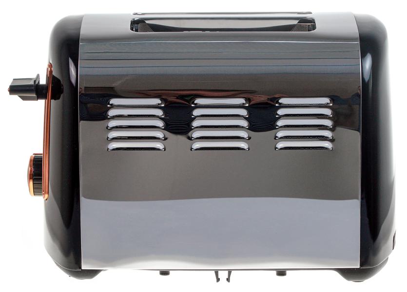 На второй торцевой стенке расположен центр управления тостером. Это широкие и невысокие кнопки со светодиодной подсветкой и круглый регулятор степени прожарки. Также там есть и рычаг для опускания ломтей хлеба. Все элементы сделаны из черного пластика и отделаны медным кантом: выглядит красиво, но, на взгляд автора обзора, как-то не очень гармонично сочетается с зеркальным металлом широких сторон.