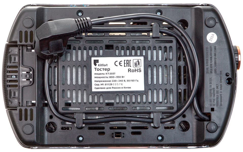 Дно тостера сделано из черного пластика и практически полностью состоит из вентиляционных отверстий. По бокам дна расположены ножки с противоскользящими накладками, а по центру — шильда со сведениями о технических характеристиках и производителе прибора. Из-под одной из ножек выходит короткий шнур питания, который можно дополнительно укоротить, закрепив на направляющих на дне.