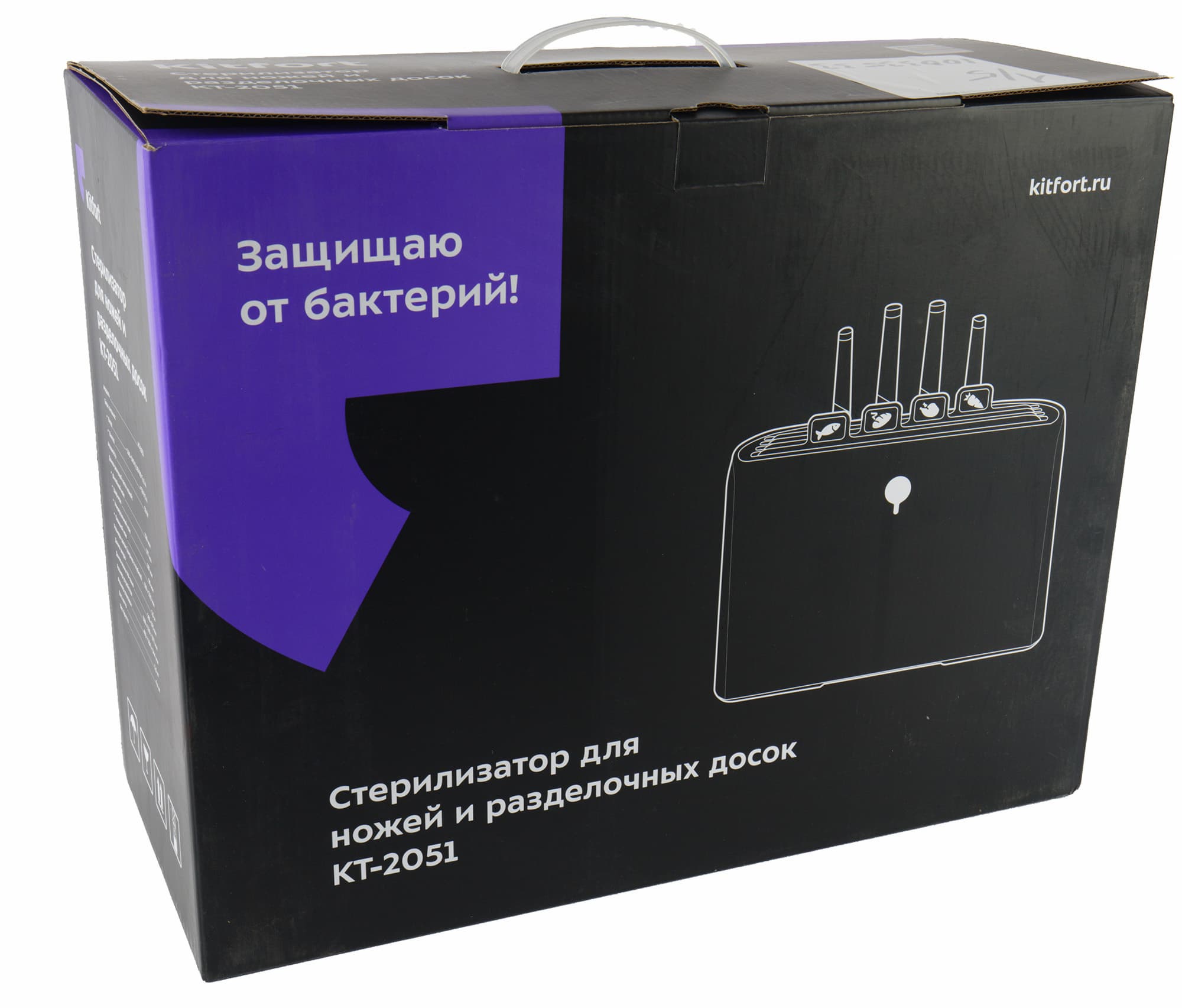 Увесистый паралеллепипед коробки мог бы вместить небольшой системный блок, почему и снабжен пластиковой ручкой для переноски. Черный матовый картон с фиолетовым акцентом традиционно для Kitfort фокусируется на названии и изображении прибора, а ключевую задачу выражает слоганом: «Защищаю от бактерий!» Среди технических характеристик на боковой стороне можно узнать даже такие нюансы, как длина режущей части каждого из четырех ножей.