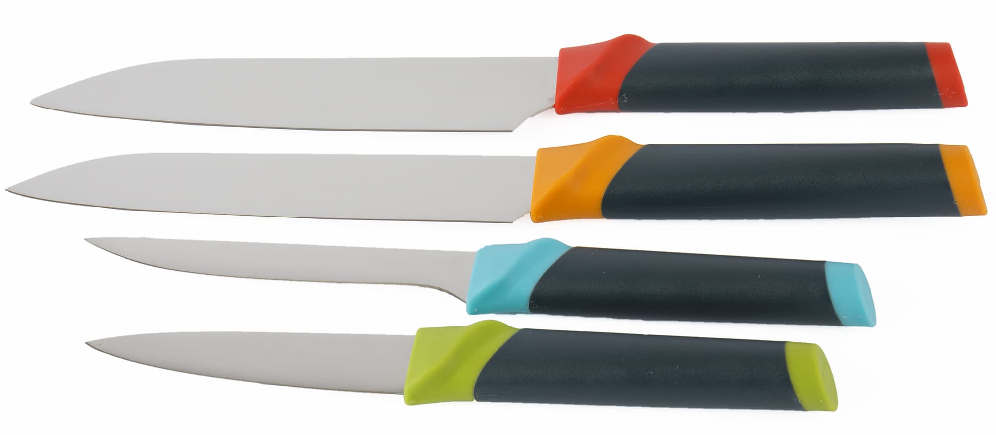 Каждый нож тщательно упакован: сначала в тонкий пакетик, затем в прозрачный чехол на лезвие и наконец, самое острие закрыто прозрачной пластиковой заглушкой, очень похожей на двухсантиметровую калошу. Ручки ножей выполнены из серого нескользящего пластика с яркими вставками тех же цветов. Форма лезвий отличается в зависимости от продуктов: маленький нож для овощей и фруктов, более длинный и узкий филейный — для рыбы, универсальный — для хлеба и самый широкий шеф-нож — для мяса. Из инструкции мы узнали, что сталь лезвий марки 5Cr15MoV долго сохраняет остроту, сопротивляется коррозии, прочна на изгиб и имеет твердость по Роквеллу 54—56 HRC — наверняка найдутся знатоки, которым это важно.