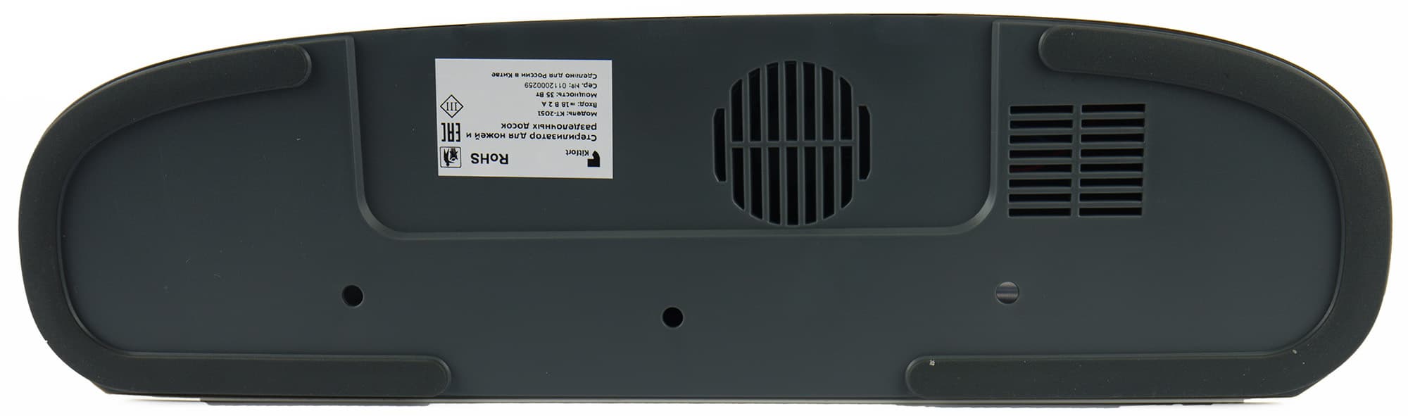 На дне корпуса есть три отверстия для циркуляции воздуха, так как стерилизатор выступает и как сушилка. Также там расположены отверстие вентилятора и наклейка с серийным номером. Прорезиненные накладки в форме подков по боковым краям основания не дадут прибору скользить.