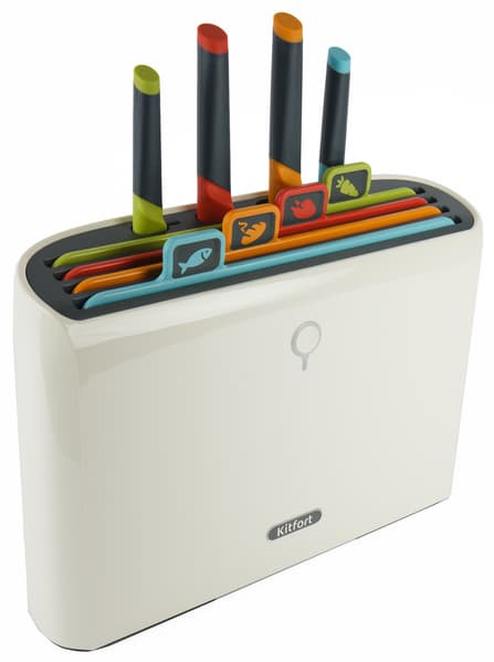 Стерилизатор досок и ножей решает проблемы тщательного очищения этих важных кухонных предметов и их компактного хранения, так как четыре доски и ножа из комплекта помещаются внутри корпуса. Маркировка цветом позволит не смешивать доски и ножи, предназначенные для разных продуктов, а разная форма лезвий упрощает нарезку. Высокопрочная сталь и качественный пищевой пластик задуманы для долгих лет комфортной эксплуатации, которая окупит разовую покупку.