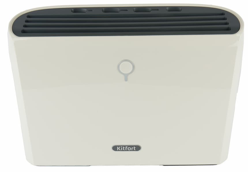 Непосредственно стерилизатор весит немного, так как его корпус выполнен из пластика: глянцевого кремового и матового серого. Конструкция Kitfort KT-2051 простая и представляет собой ящик с отверстиями под доски и ножи в верхней части и двумя ультрафиолетовыми лампами внутри. На передней части находятся единственная кнопка включения и логотип компании.