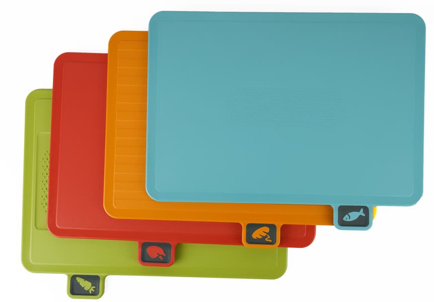 Доски в комплекте нам понравились всем: оптимальные размеры, накладки от скольжения на одной стороне, прочный пищевой пластик, разные цвета и значки для соответствующих продуктов. Приятными сюрпризами стали встроенная мини-терка на доске для овощей (например, можно быстро добыть цедру или натереть имбирь), блок с точками по центру доски для рыбы и рифленая поверхность доски для хлеба. Единственным недостатком комплекта мы бы могли назвать немалый вес досок из-за толщины.