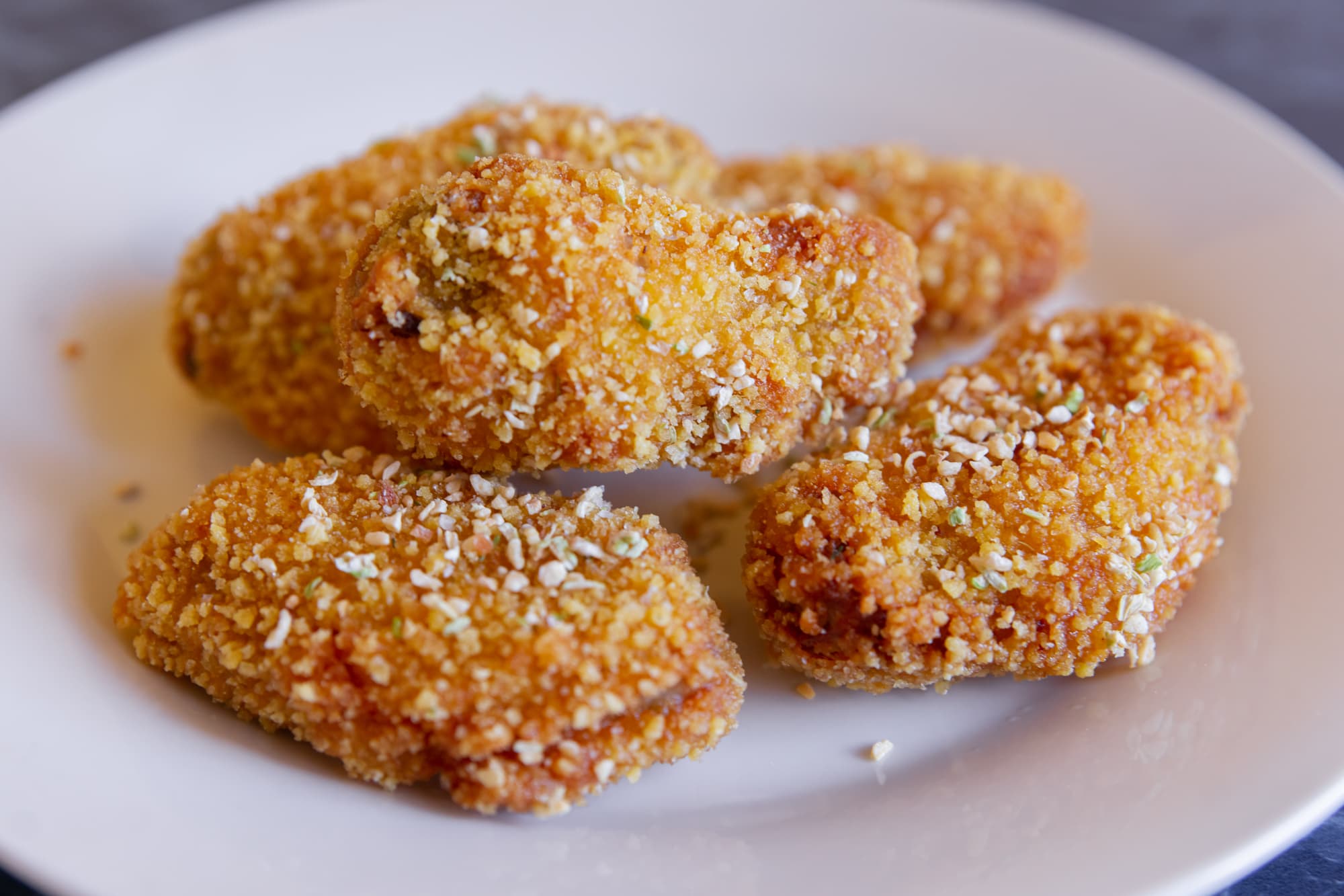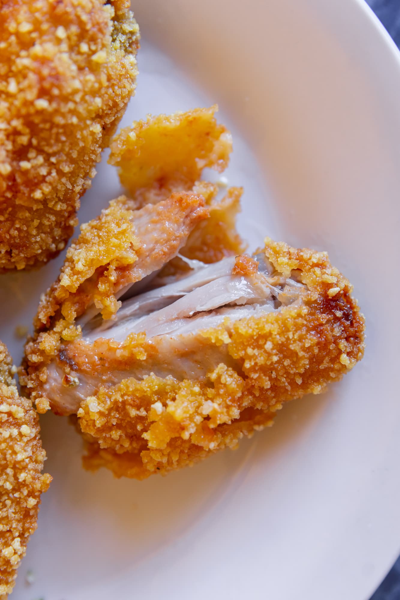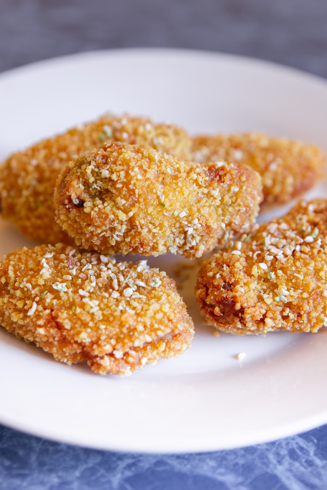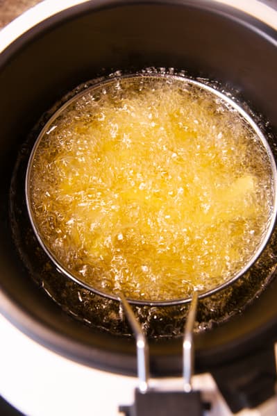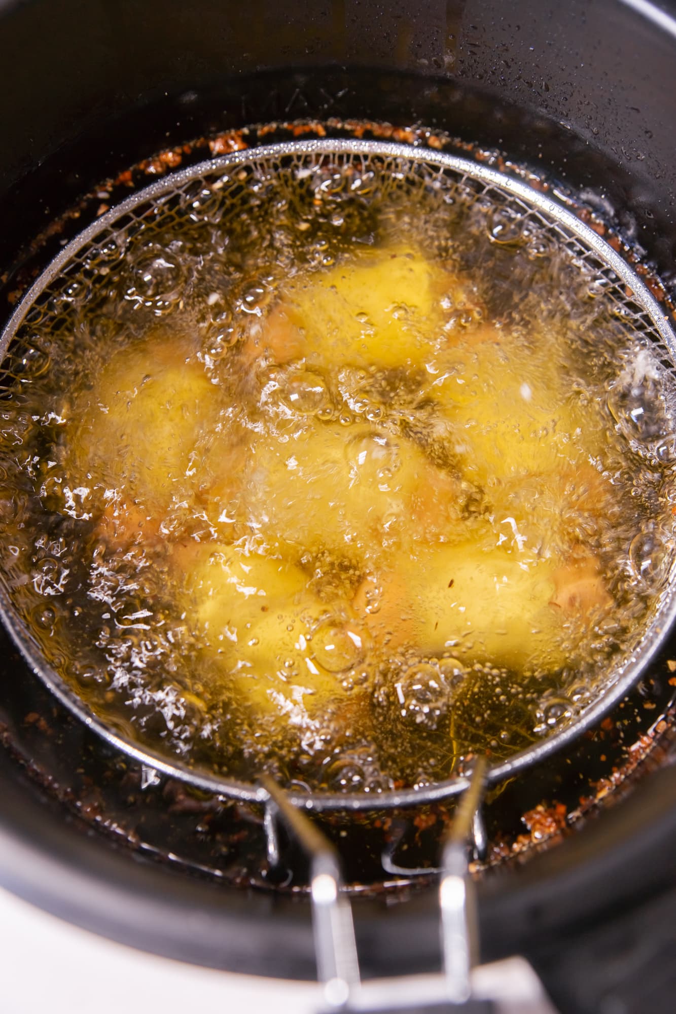 Пролежавшие час в остром маринаде куриные крылышки обмакнули в кляр, затем густо обваляли в панировке, сложили в корзину и опустили в масло, нагретое до 170 градусов. При погружении корзины масло умеренно кипело, но никаких брызг, вылетающих за пределы чаши, мы не увидели.
