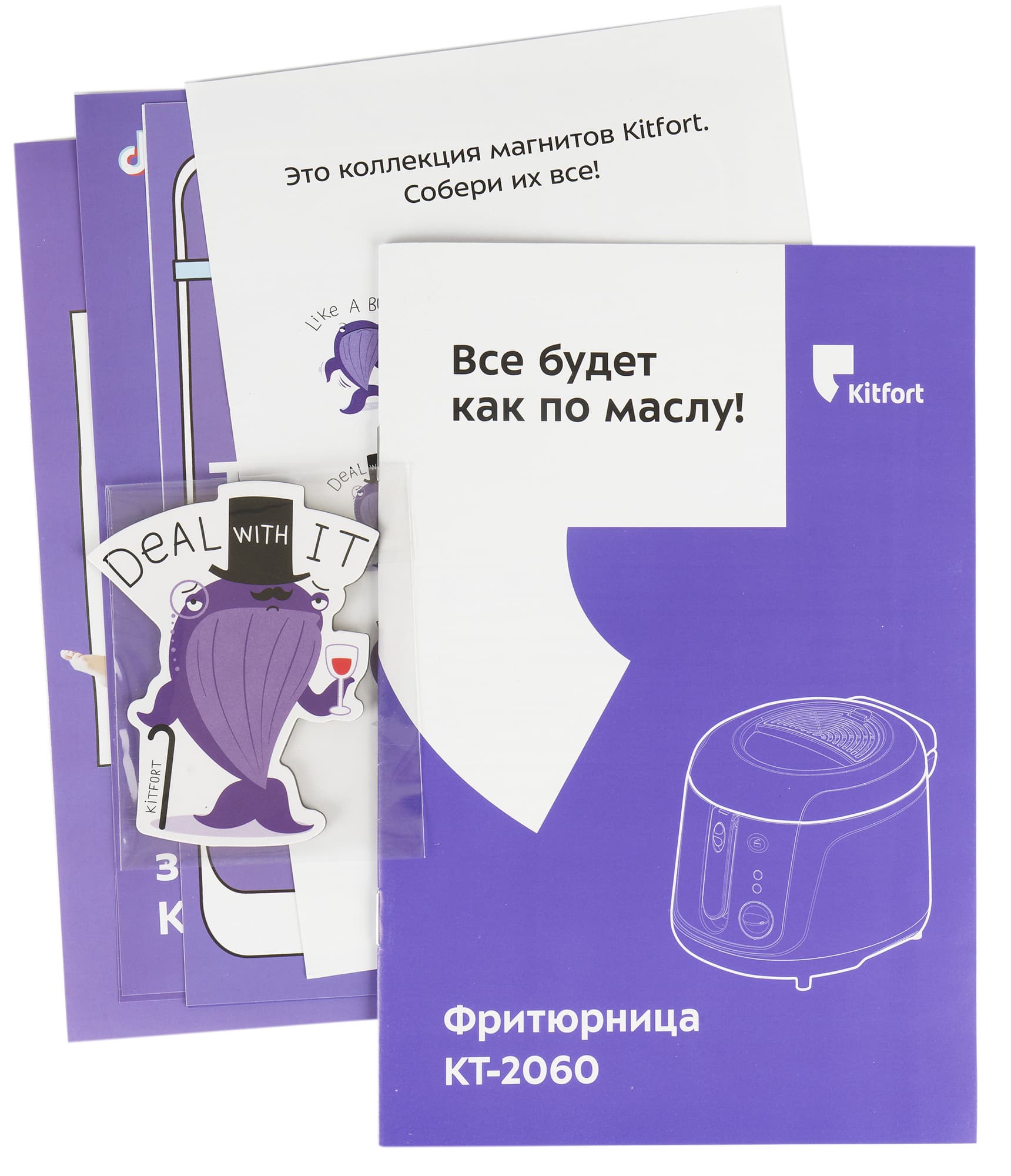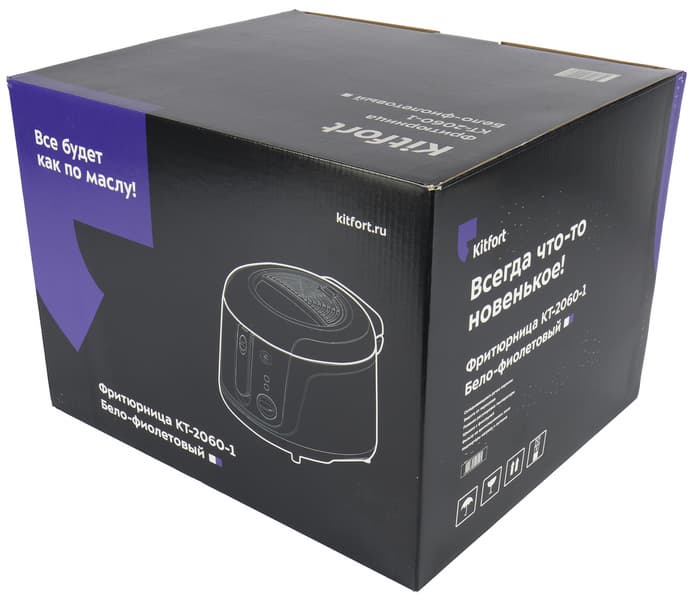 Упаковка фритюрницы оформлена в фирменной стилистике компании Kitfort: на черном фоне изображены схематические рисунки прибора, белым шрифтом напечатано полное название модели, краткое описание ключевых особенностей устройства, а на фиолетовой вставке в левом верхнем углу — шутливый слоган-заверение «Все будет как по маслу!».