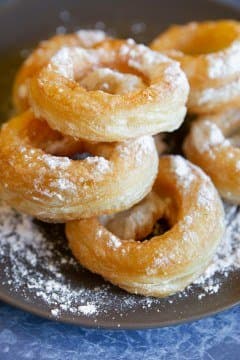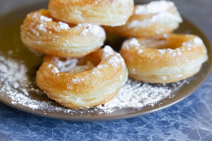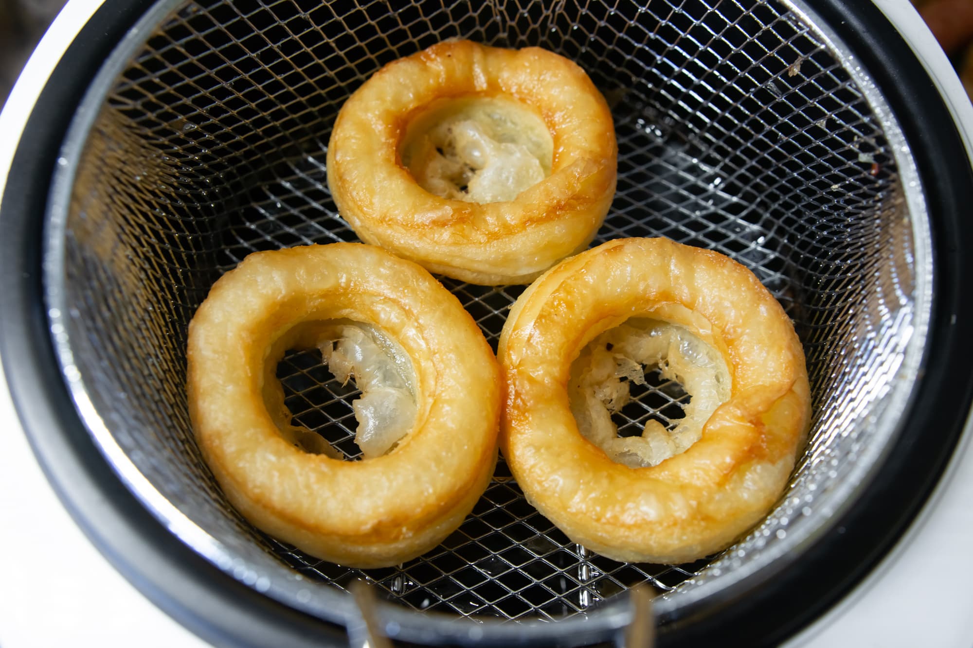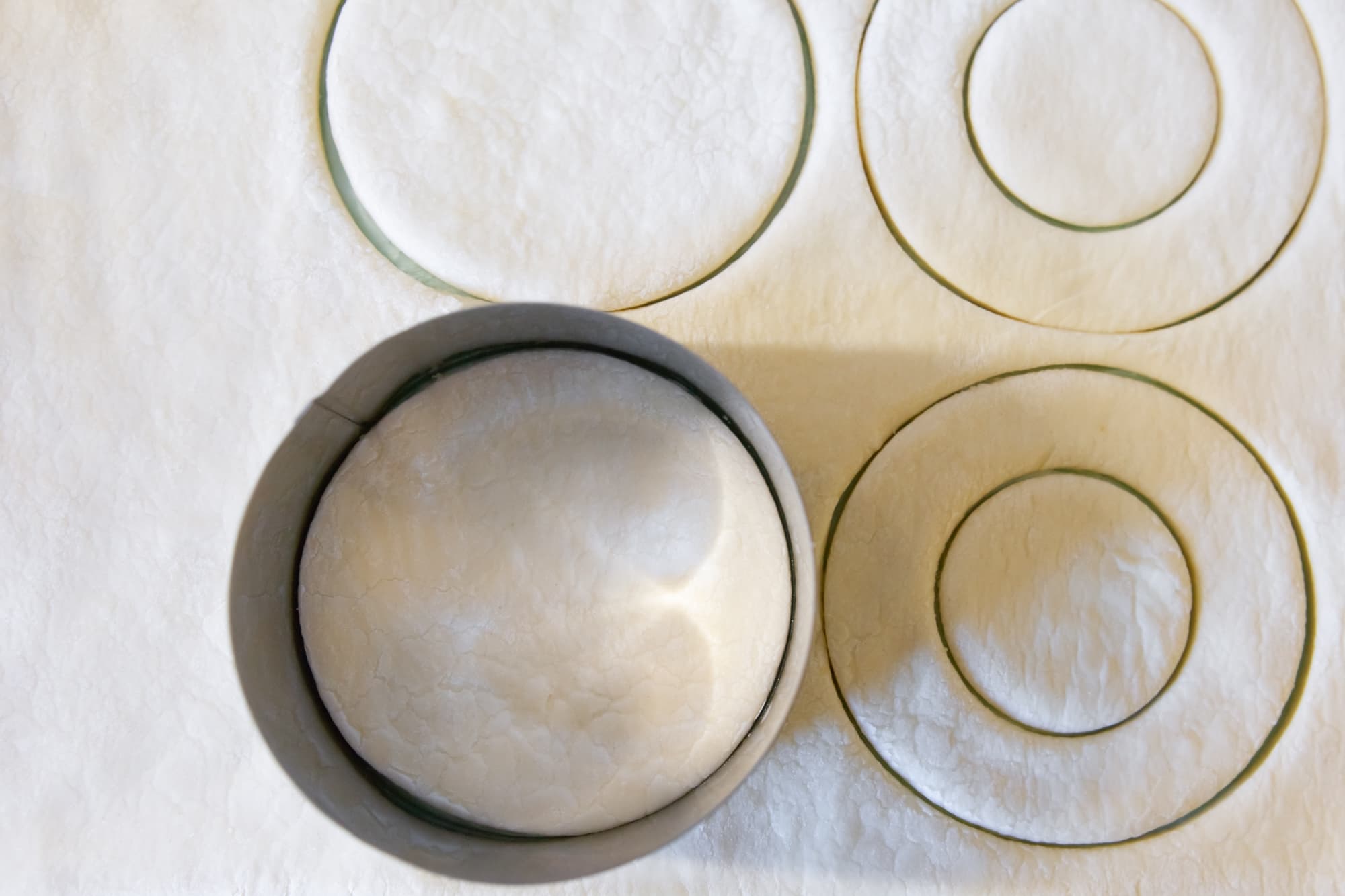 В то время как масло во фритюрнице нагревалось до 160 °C, из листа слоеного теста при помощи специальной формы мы вырезали кольца будущих пончиков.