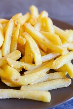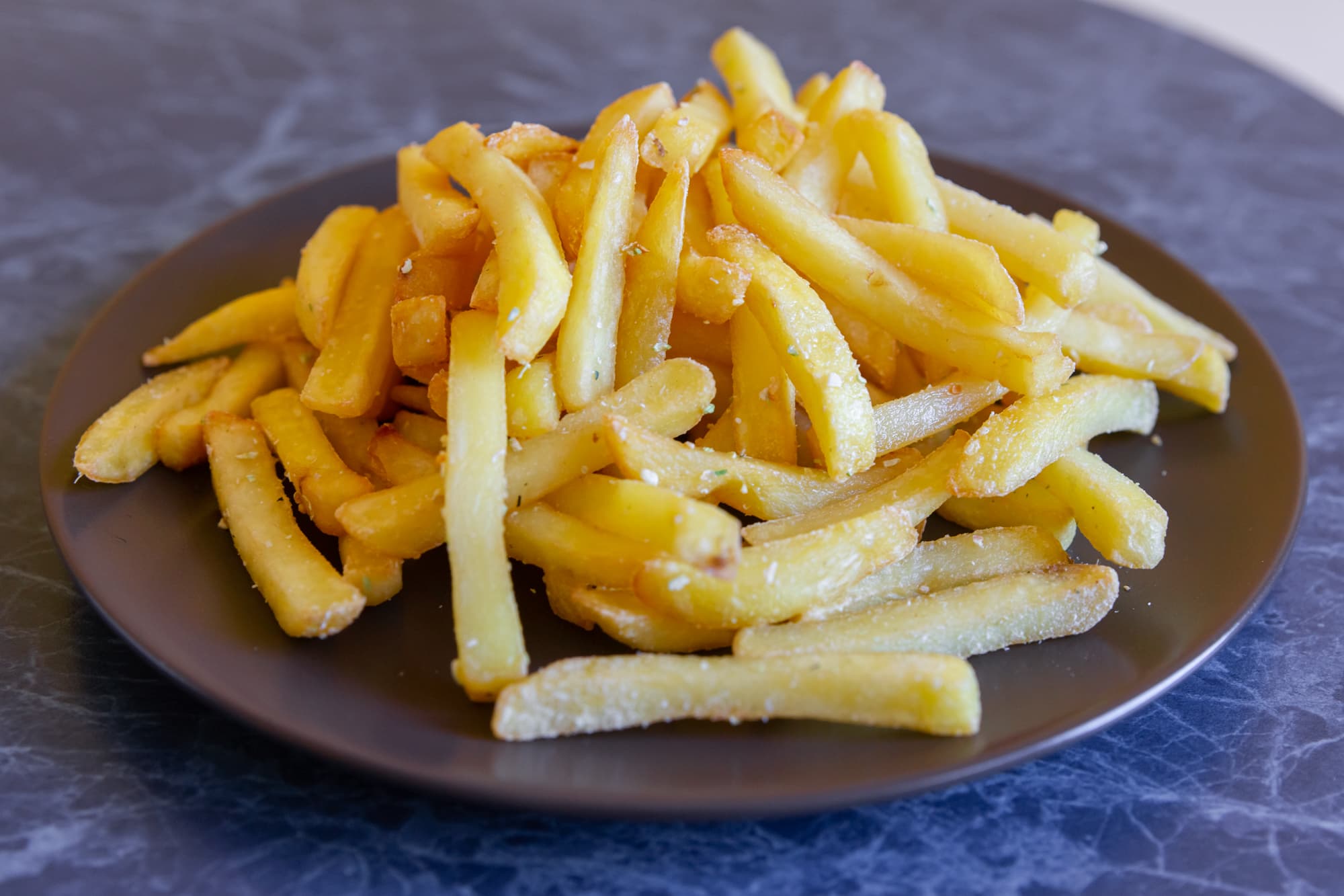 Через 7 минут выключили фритюрницу, зацепили корзинку за борт чаши и дали маслу стечь. Присыпали картофель солью с приправами, перемешали и тут же приступили к дегустации.