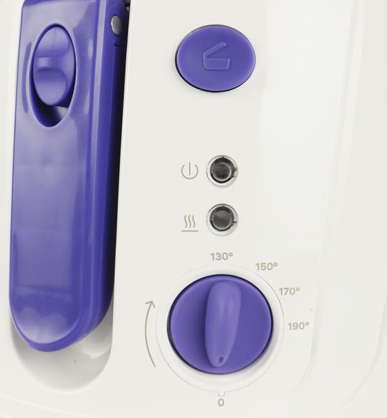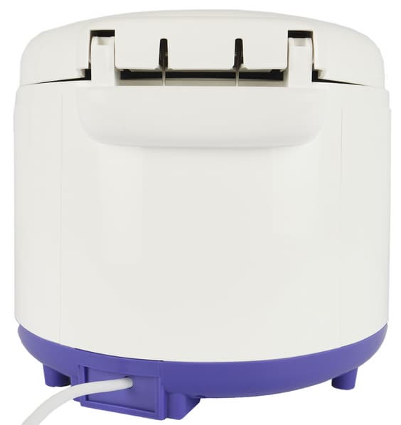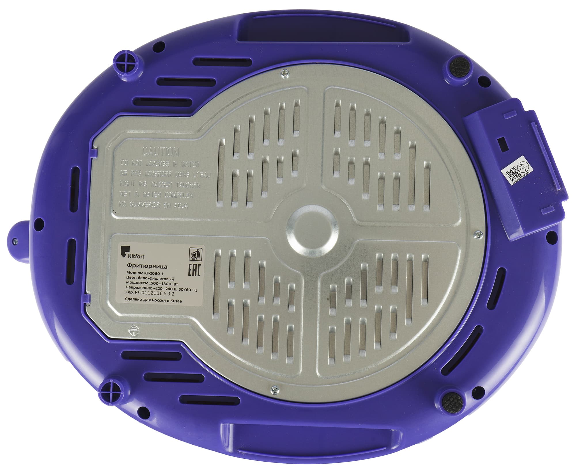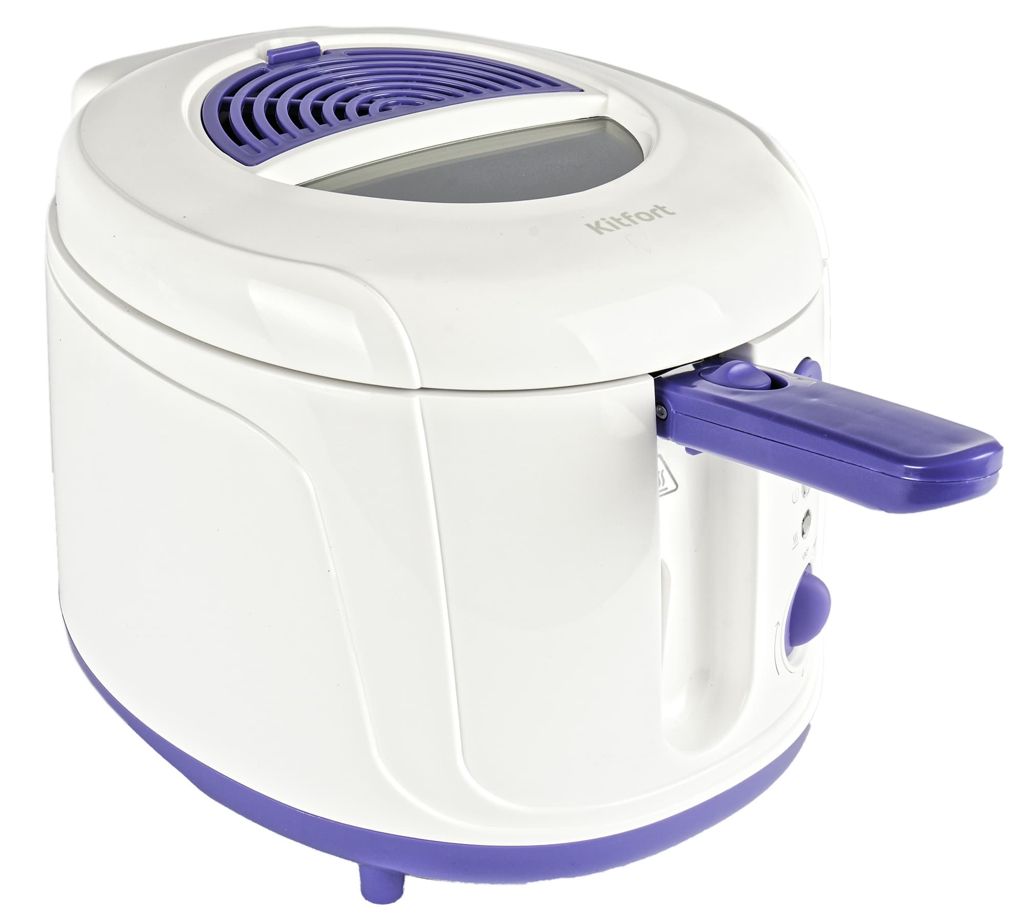Лаконичный бело-фиолетовый корпус Kitfort KT-2060 изготовлен из глянцевого пластика. По форме фритюрница походит на небольшую мультиварку. Конструкция прибора представляет собой корпус с чашей внутри и крышкой.