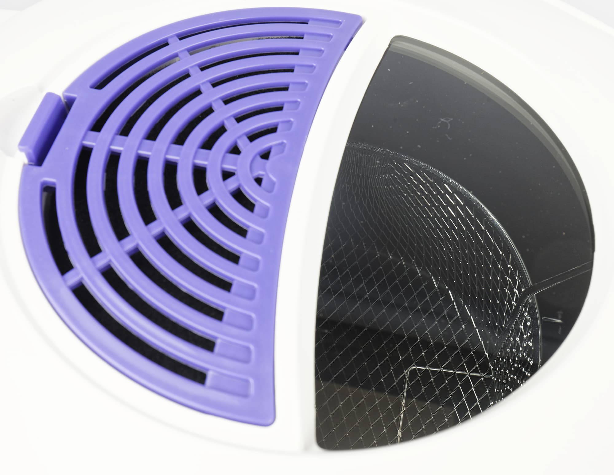 Половину крышки занимает смотровое окошко из прозрачного пластика. С внутренней стороны крышки мы видим металлическую вставку, часть которой — вентиляционная решетка. С внешней стороны в нее уложены два фильтра, прикрытые сверху пластиковой съемной решеткой.