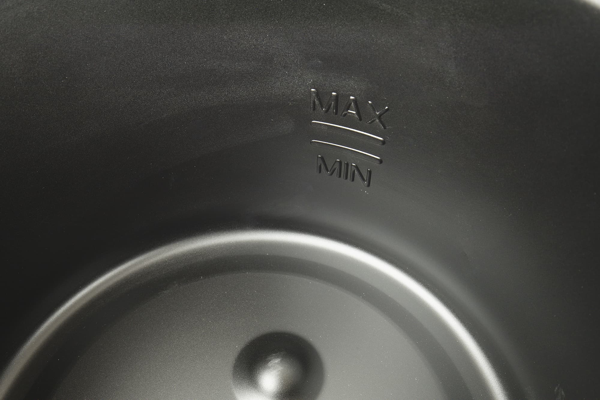Внутри круглой чаши, с антипригарным покрытием есть отметки о минимальном и максимальном уровне заливаемого масла. Min — 2 л, Max — 2,5 л. На дне виднеется небольшая выпуклость, совмещаемая с вогнутой частью соответствующего размера на дне корзинки.