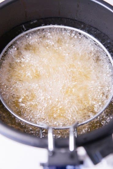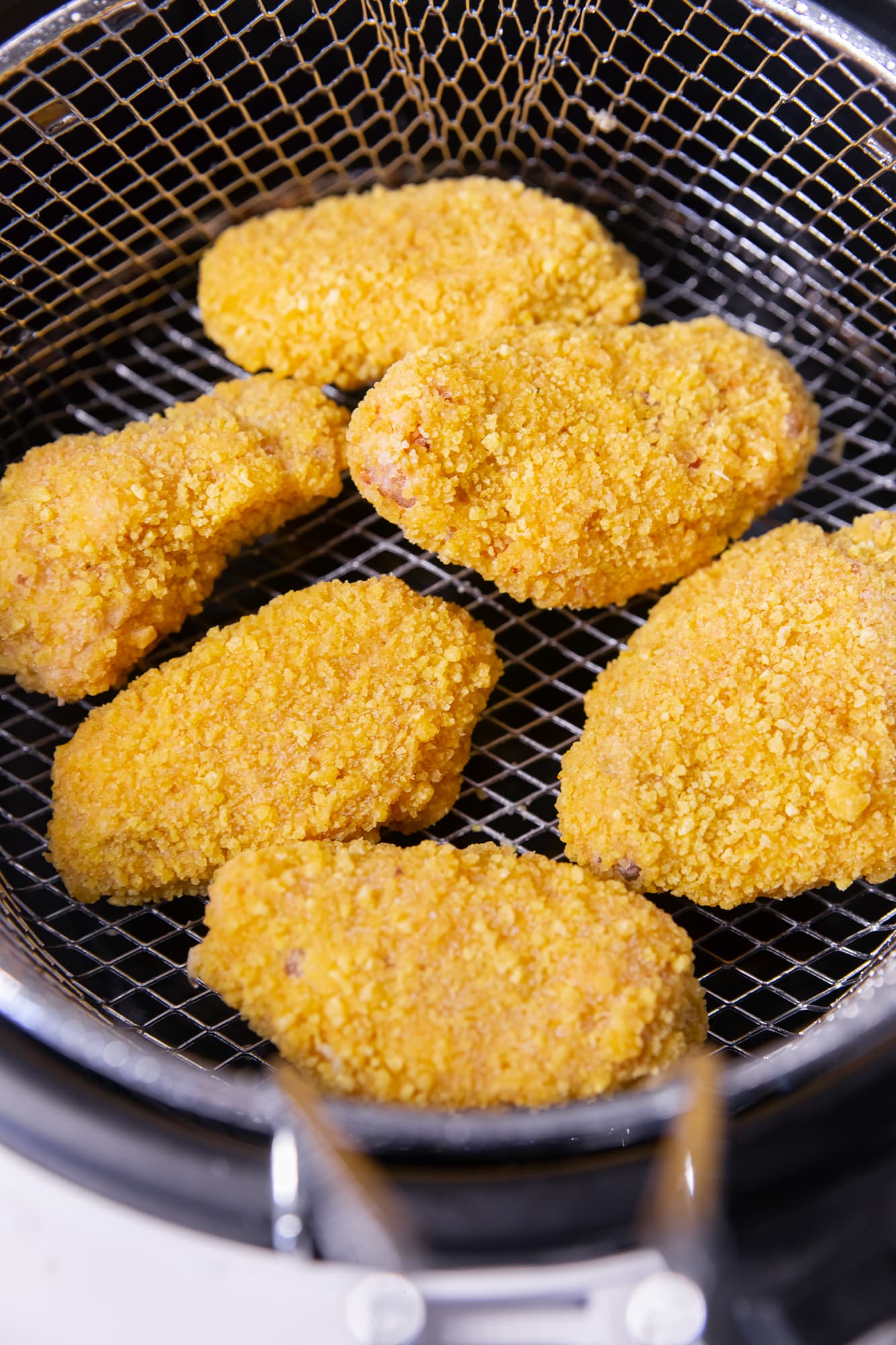 Закрыли крышку и жарили крылышки в течение 10 минут. По истечении этого времени открыли крышку, подняли корзину, зацепив ее за край чаши, и дали лишнему маслу стечь.