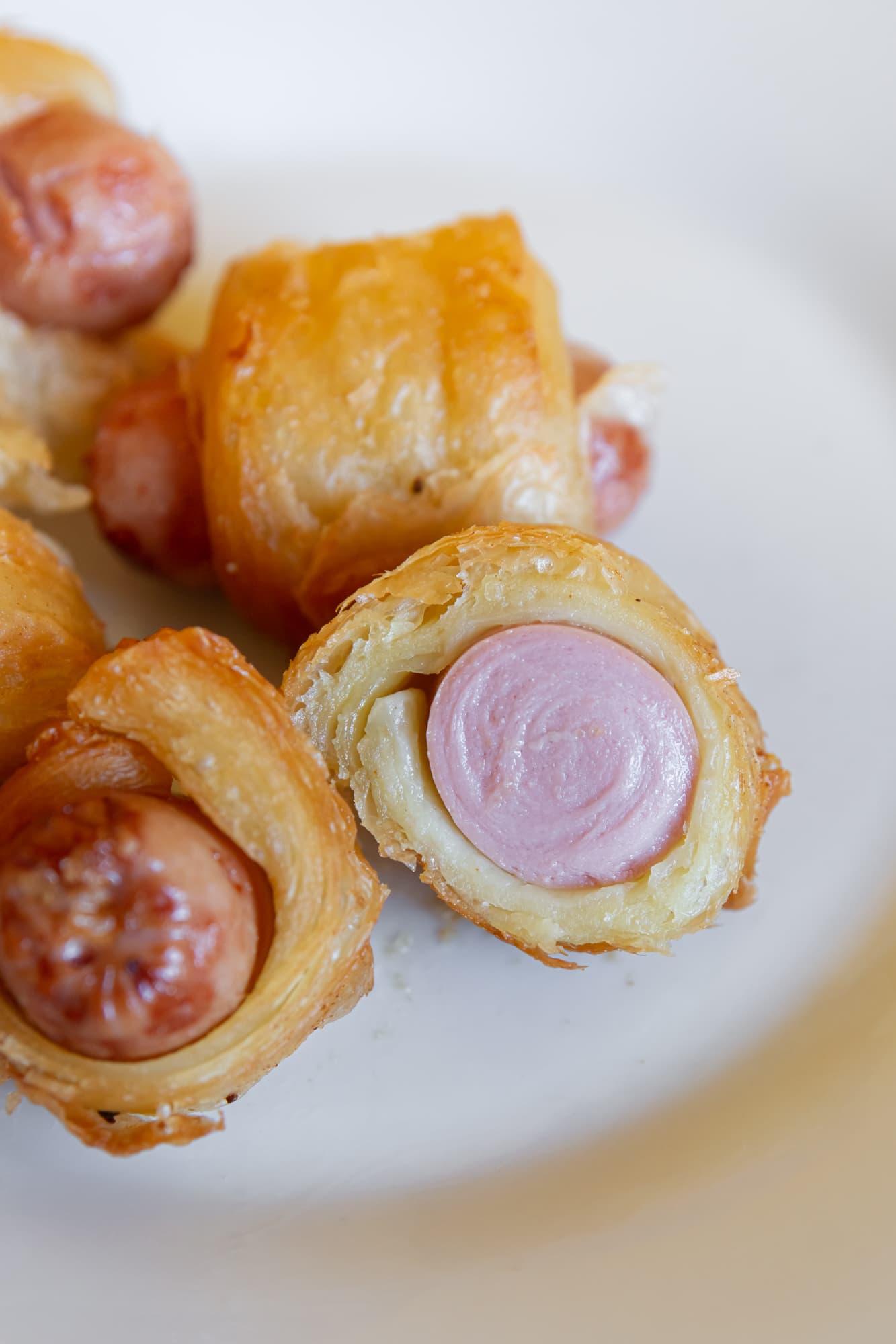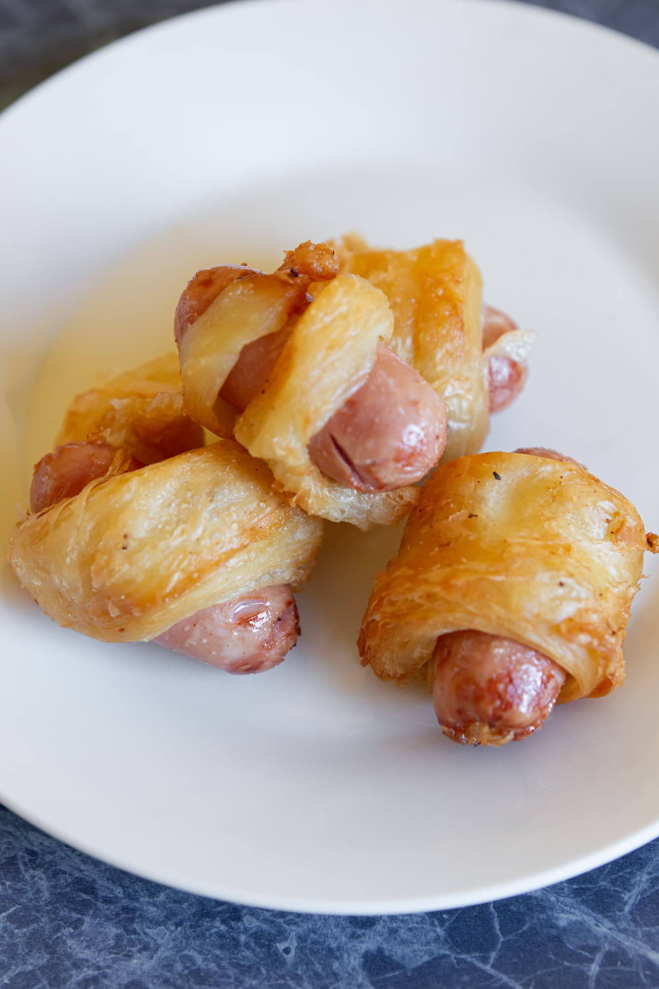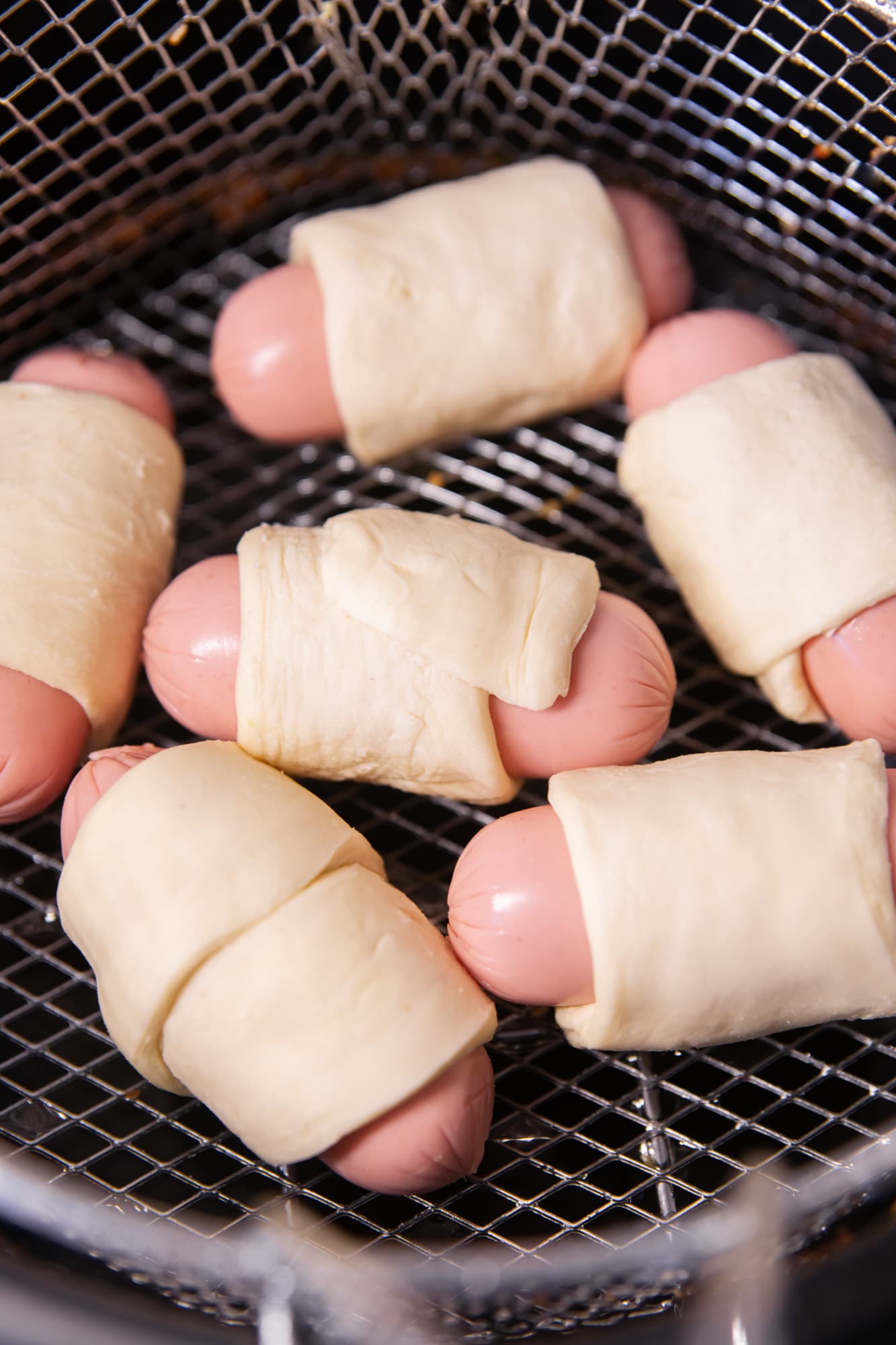 Слоеное тесто нарезали на полоски, обернули ими сосиски, выложили в корзинку и опустили в масло, нагретое до 170 градусов.