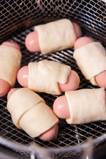 В общей сложности сосиски готовились около 5 минут. Как только пышное тесто покрылось аппетитной корочкой, выключили нагрев и подняли корзинку, чтобы дать маслу стечь.