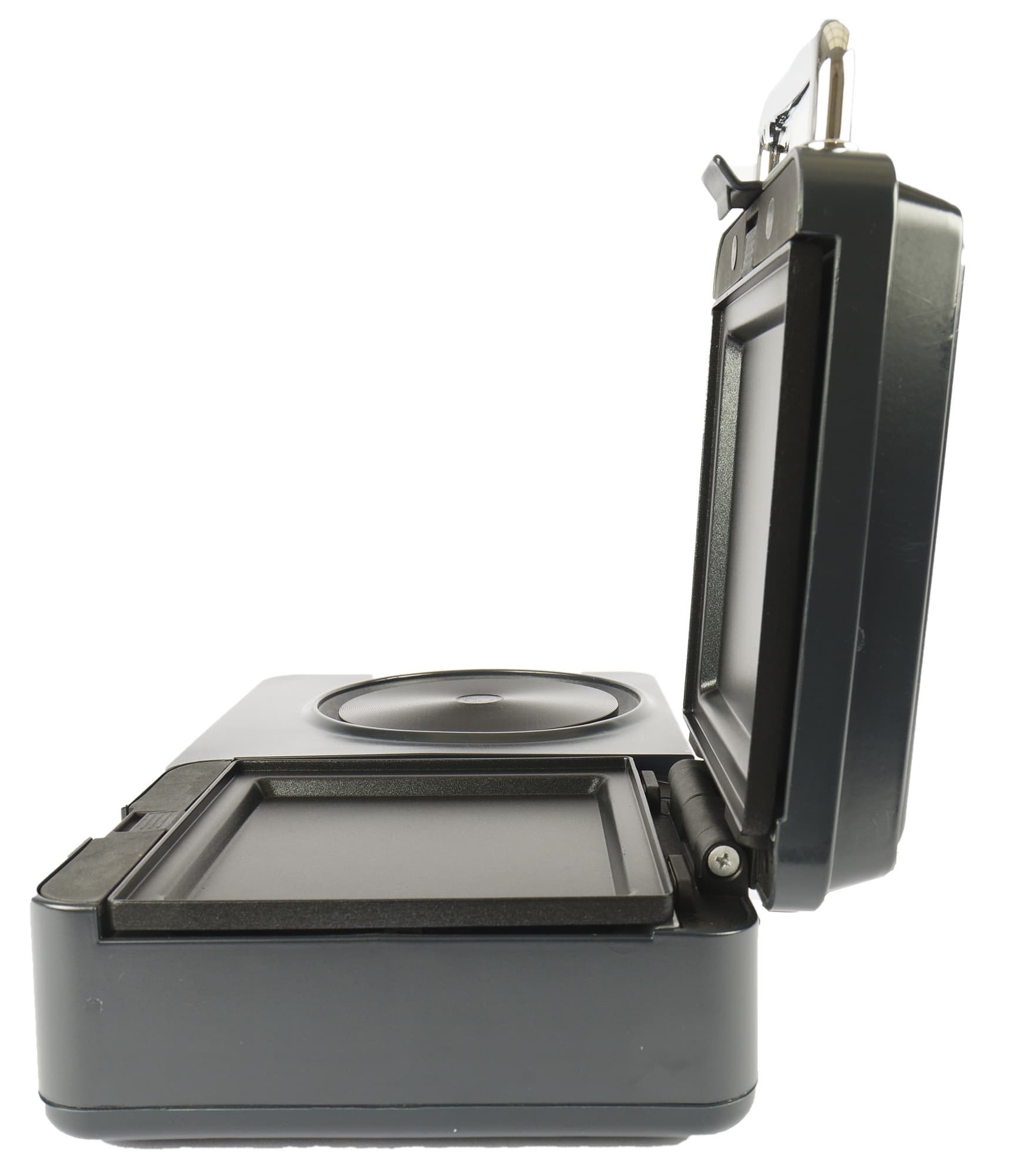 Верхняя панель гриля открывается при нажатии на пластиковый зажим и откидывается на 90 градусов.