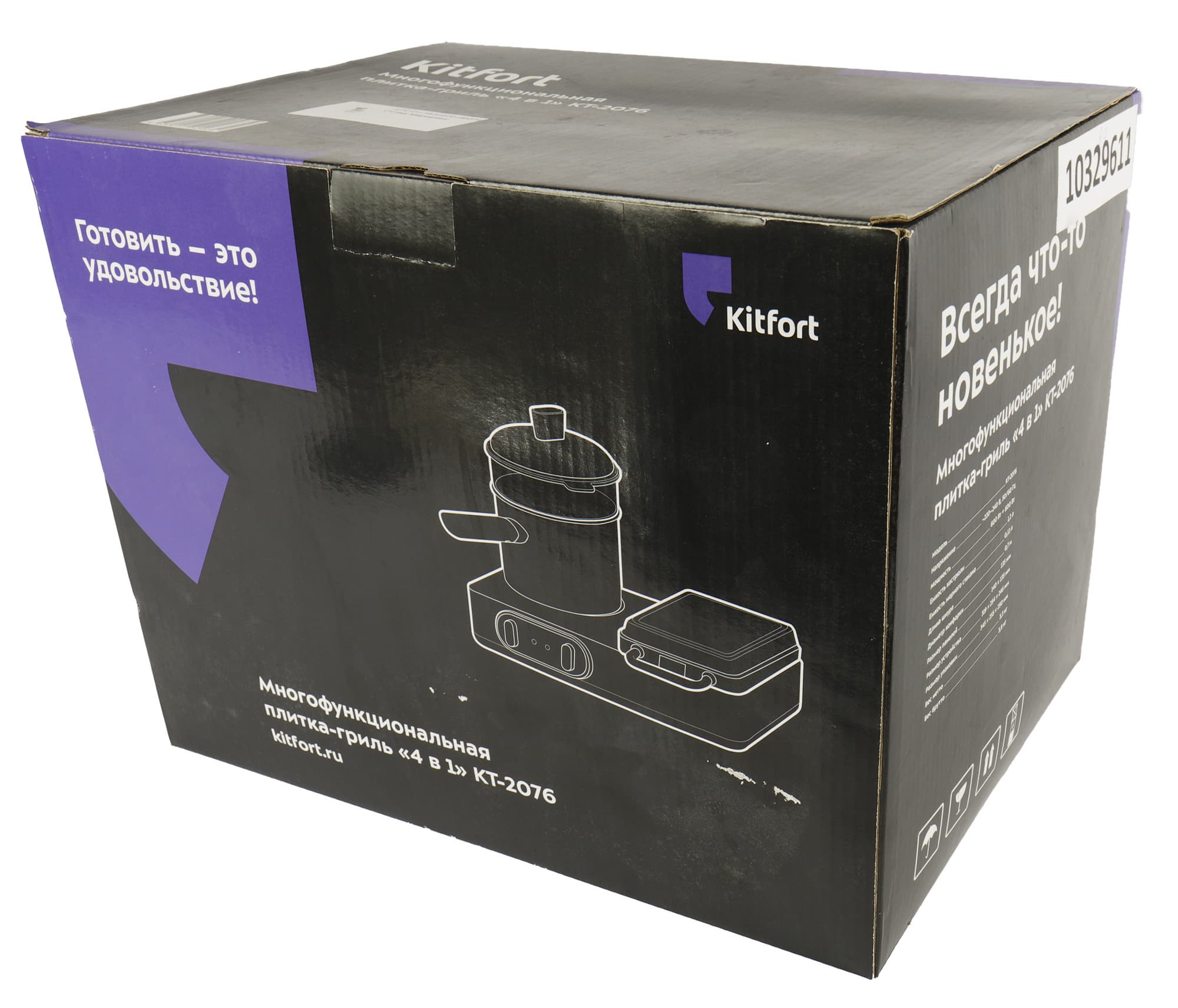 Плитка-гриль поступила к нам на тестирование в коробке фирменной черно-фиолетовой расцветки. На упаковке схематически изображен сам прибор, а также напечатаны его полное название, логотип компании, технические характеристики и краткое описание основных особенностей модели.