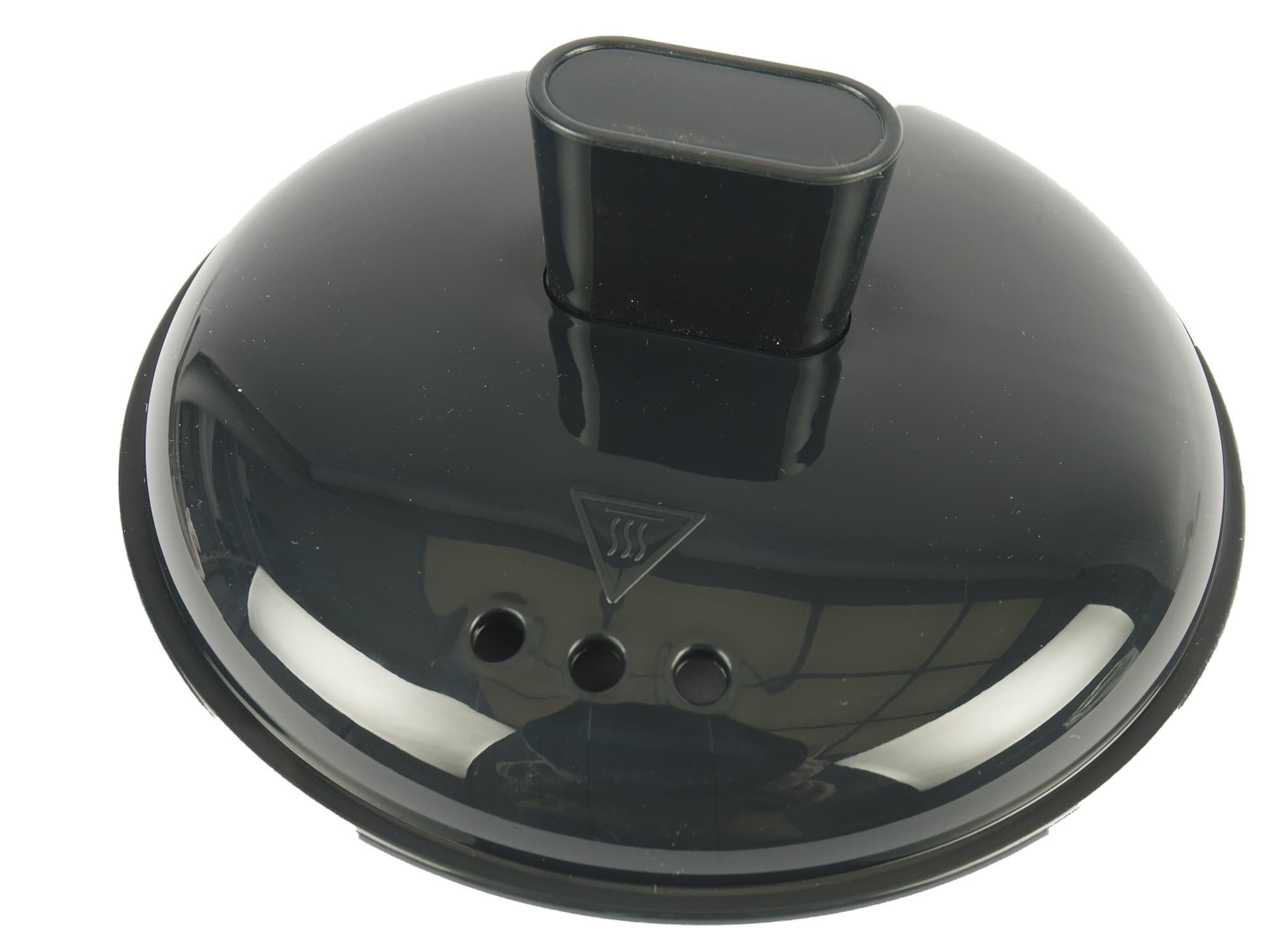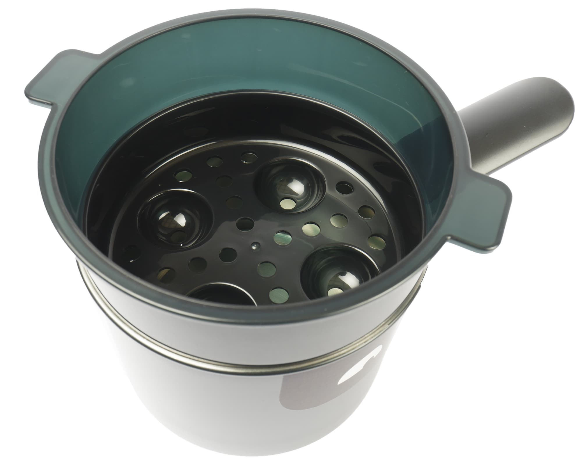 Вставка-пароварка из темно-зеленого пластика на дне, как положено, имеет круглые отверстия, а кроме них, еще и четыре углубления, видимо для яиц. По бокам емкости две небольшие ручки.
